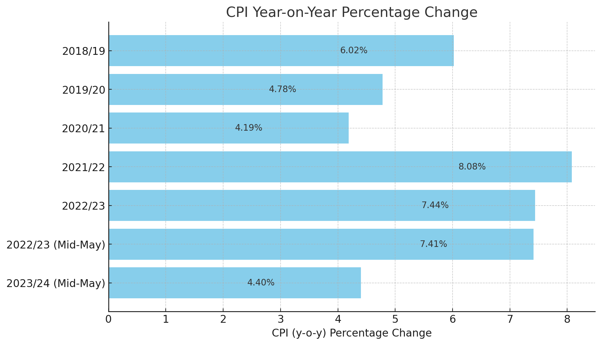 2022/23: As of mid-May, the CPI was at 7.41%, indicating consistent inflationary pressures from the previous year.