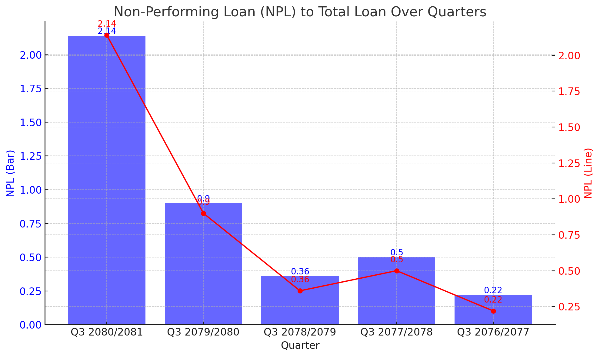 The NPL ratio had been relatively stable and low in the preceding quarters, with Q3 2078/2079 showing a ratio of 0.36%, Q3 2077/2078 at 0.5%, and the lowest at 0.22% in Q3 2076/2077. The current spike to 2.14% suggests a deterioration in the bank's loan portfolio quality.
