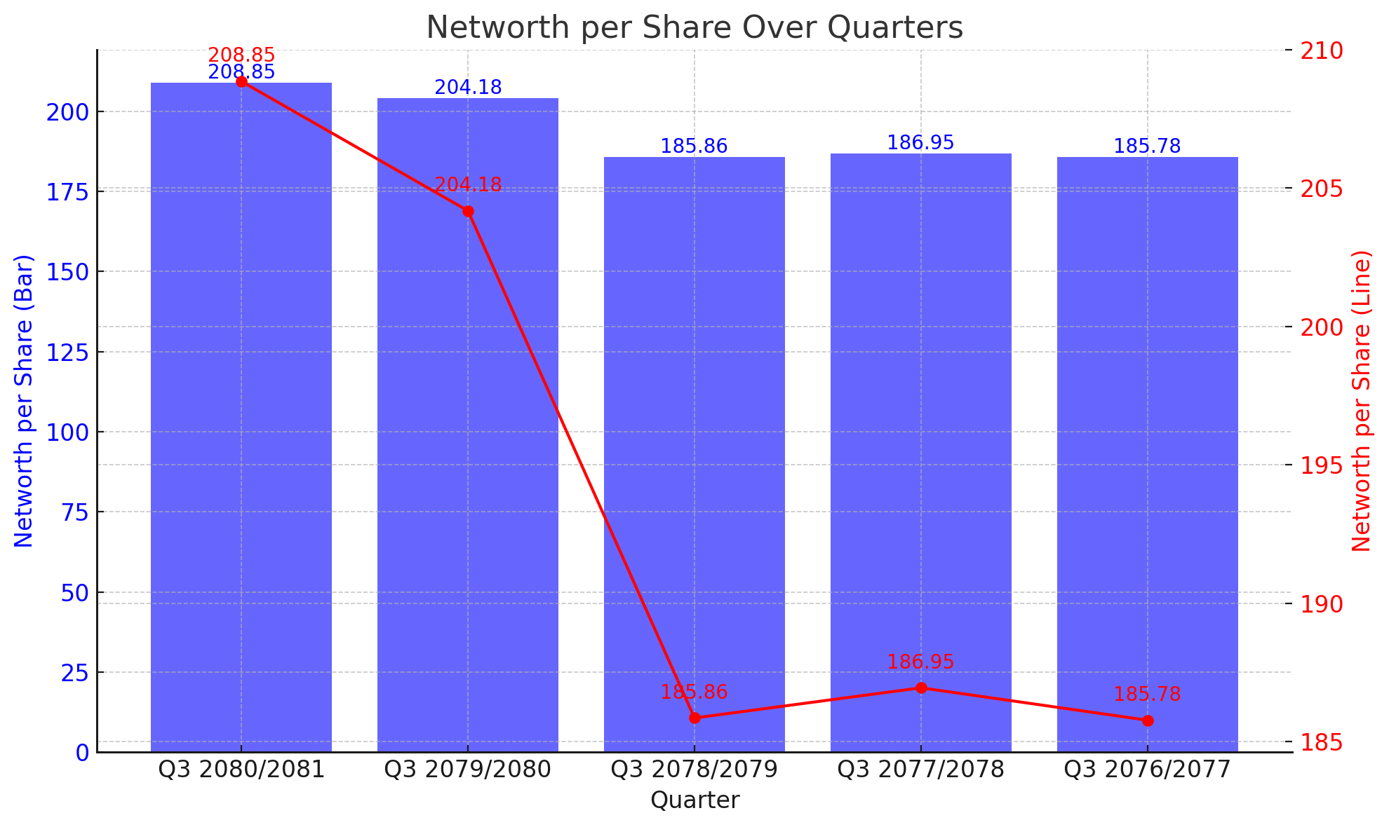 The latest quarter, Q3 2080/2081, shows an increase in the Networth per Share to Rs. 208.85, up from Rs. 204.18 in Q3 2079/2080. This upward trend indicates that the bank has been successful in enhancing its shareholder equity over the past five quarters.