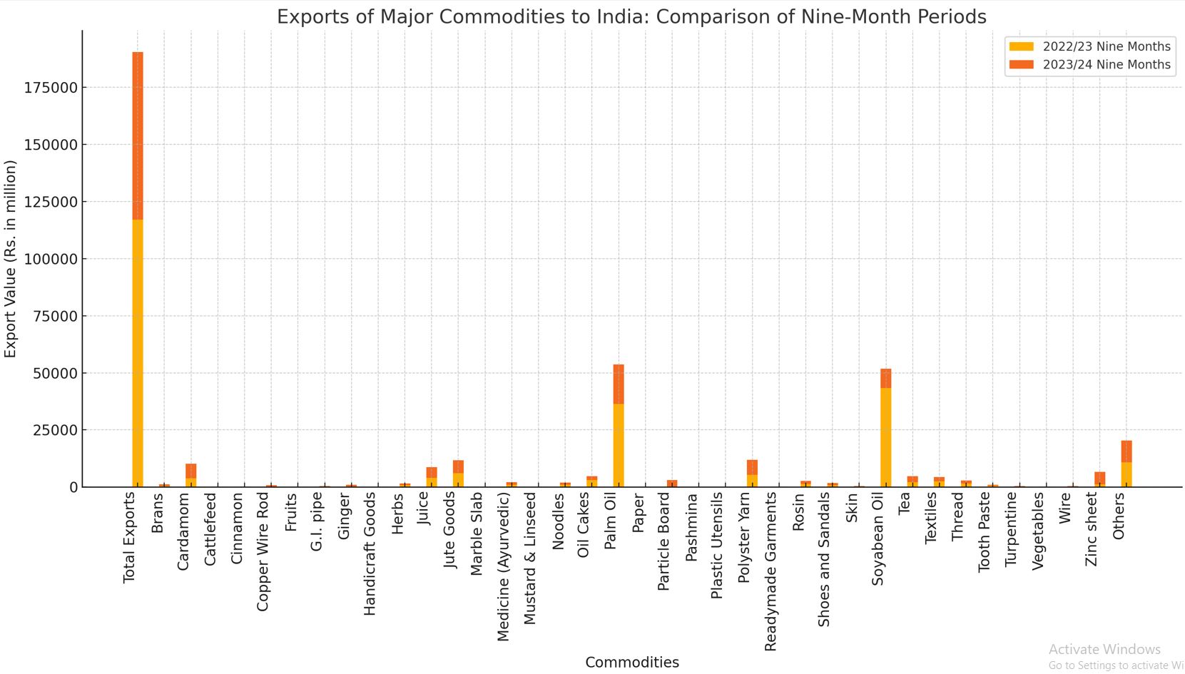 The data highlights a concerning trend of declining exports to India across several key commodities. While certain categories such as ginger, herbs, and specific manufactured goods have shown growth, the overall export performance reflects significant challenges. The drastic declines in major export commodities like soyabean oil and palm oil have heavily impacted the total export values.