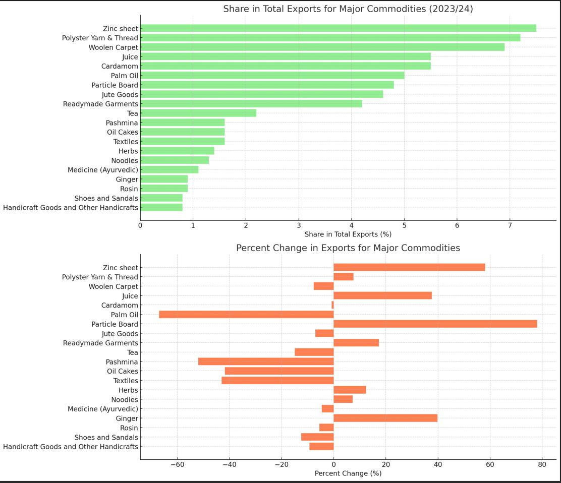 Analysis of Major Commodity Exports in Nepal (2023/24): Share in Total Exports and Percent Change