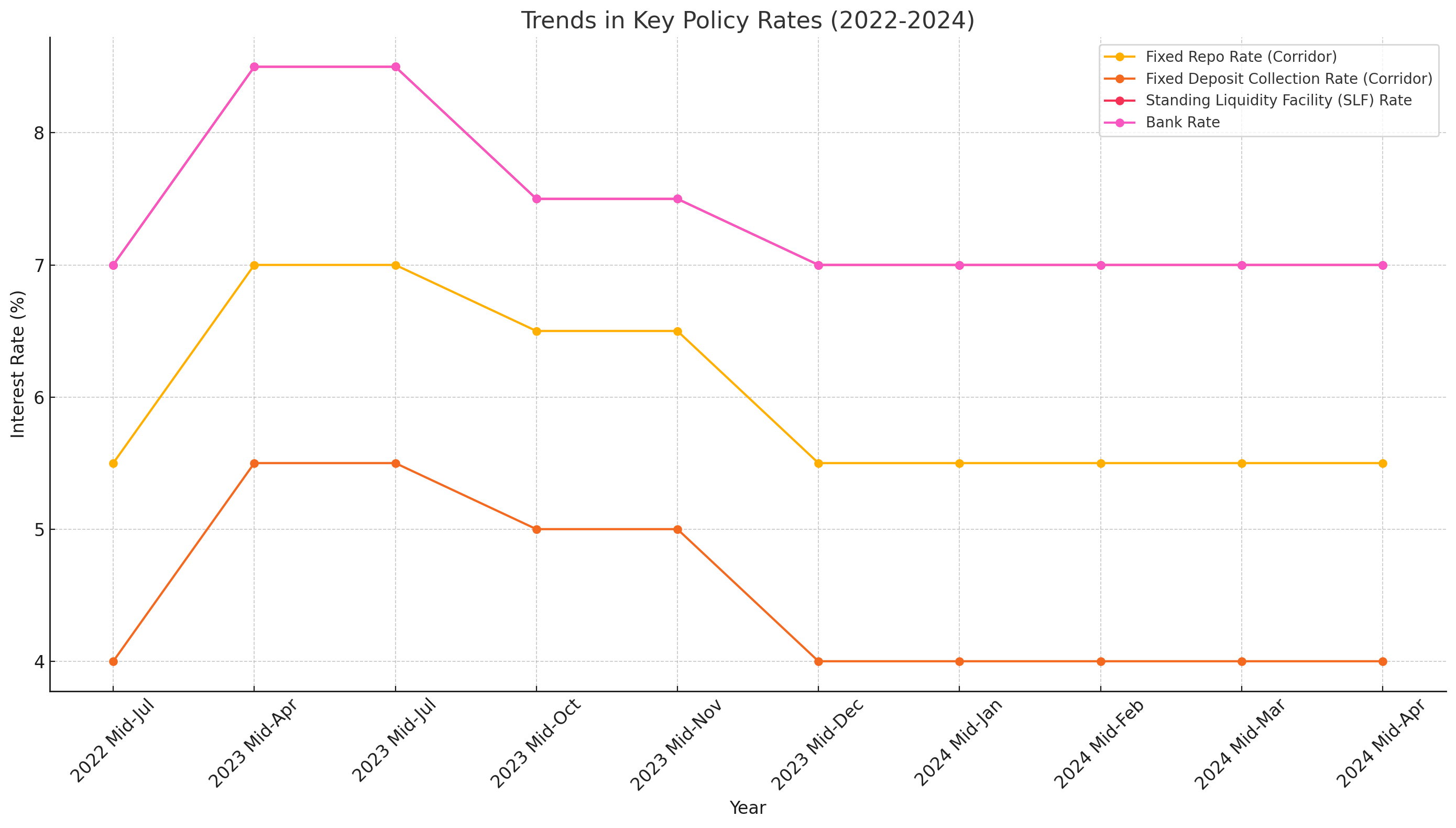 The Standing Liquidity Facility (SLF) rate experienced an increase from 7.0% to 8.5% in mid-April 2023 but returned to 7.0% by mid-April 2024. Meanwhile, the bank rate has consistently decreased from 7.0% to 7.0% within the same timeframe.