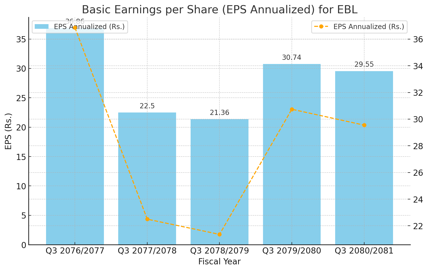 Fiscal Year 2076/2077: EBL experienced its highest EPS at 36.86 Rs. This represents a peak in profitability.