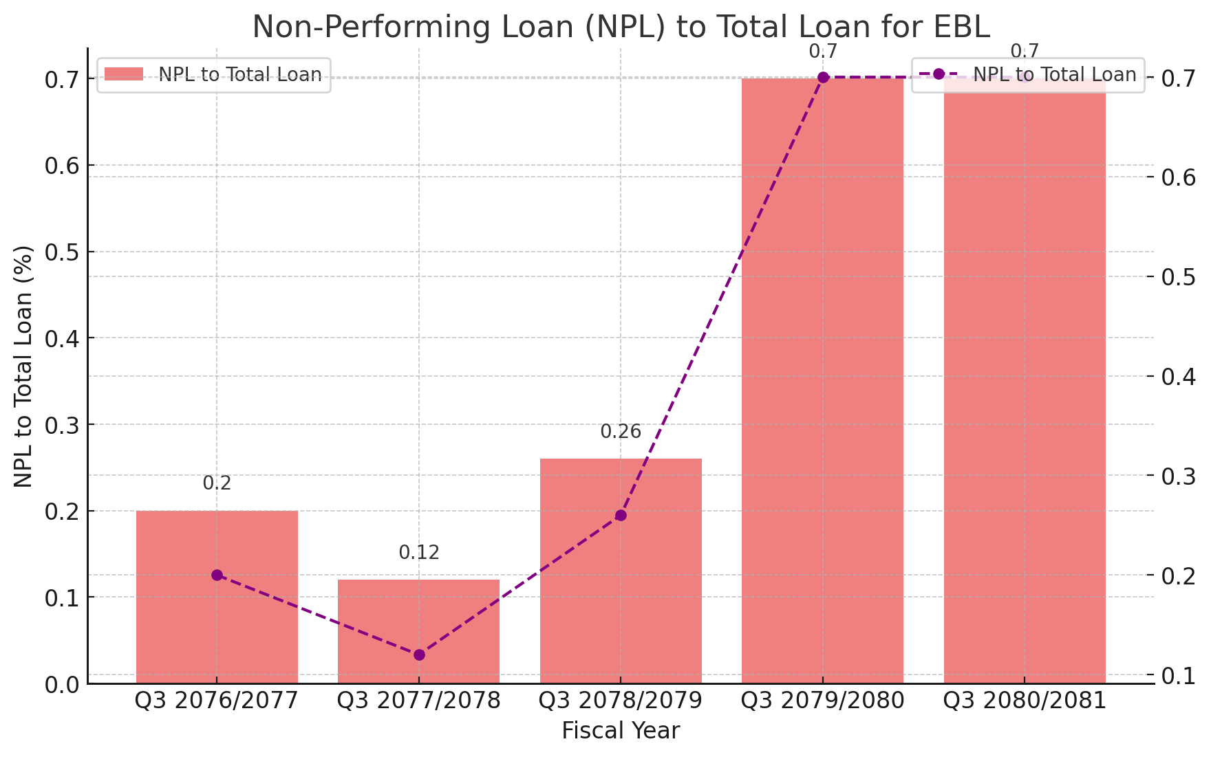 The data shows that EBL experienced fluctuations in its NPL ratio over the last five years. The lowest NPL ratio was recorded in the fiscal year 2077/2078, suggesting an effective period in managing non-performing loans. However, this was followed by a steady increase, culminating in a significant spike in the fiscal year 2079/2080, which persisted into 2080/2081.