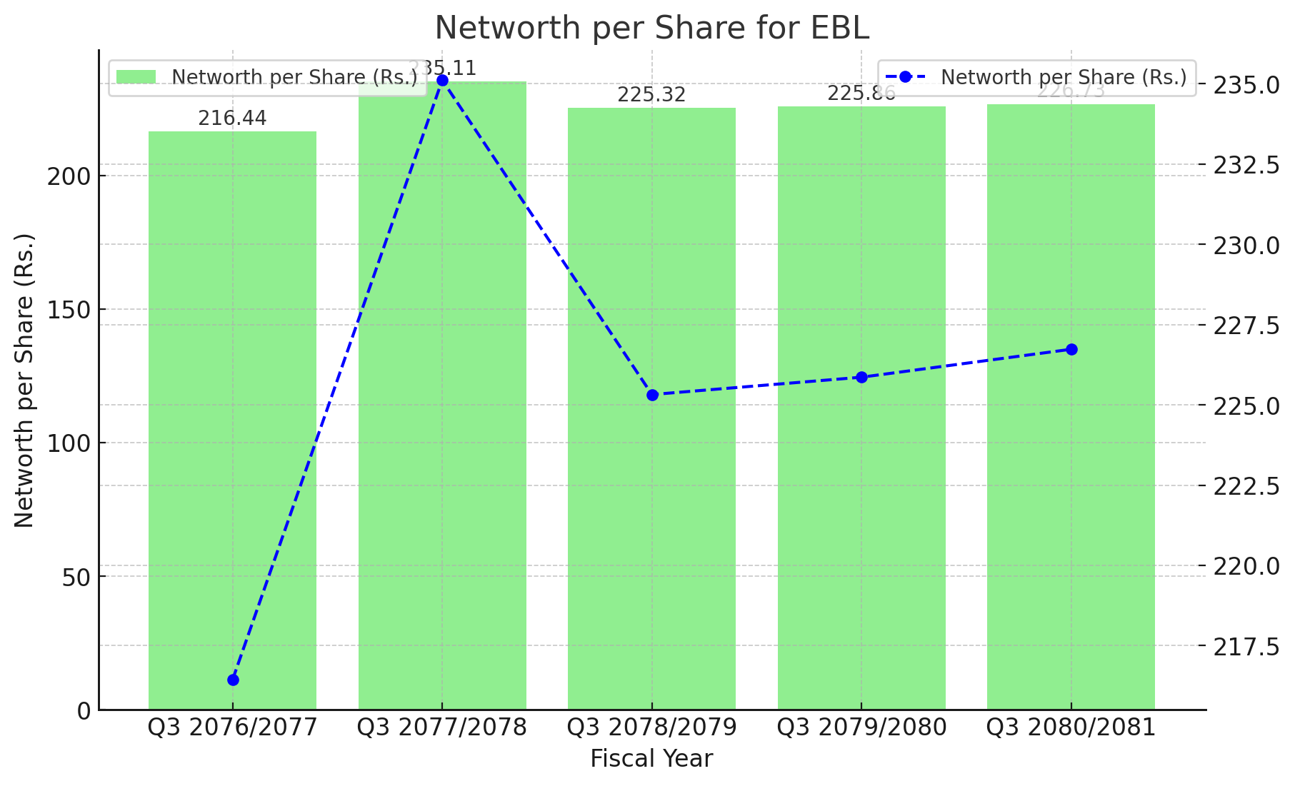 The data shows that EBL's Networth per Share has generally remained stable over the last five years, with a significant increase observed in the fiscal year 2077/2078. The highest net worth per share was recorded in this year, suggesting a period of strong financial performance and growth in the bank's equity base.