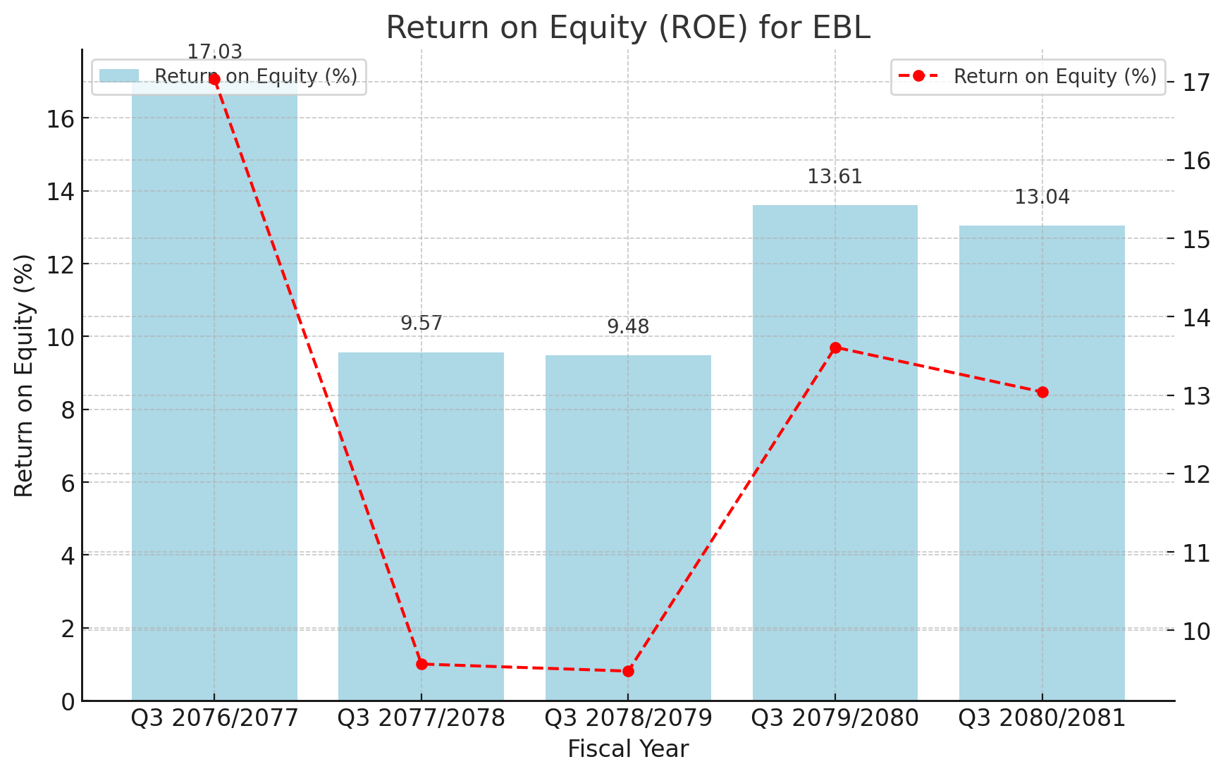 Fiscal Year 2076/2077: EBL had a high ROE of 17.03%, indicating strong profitability relative to its equity.
