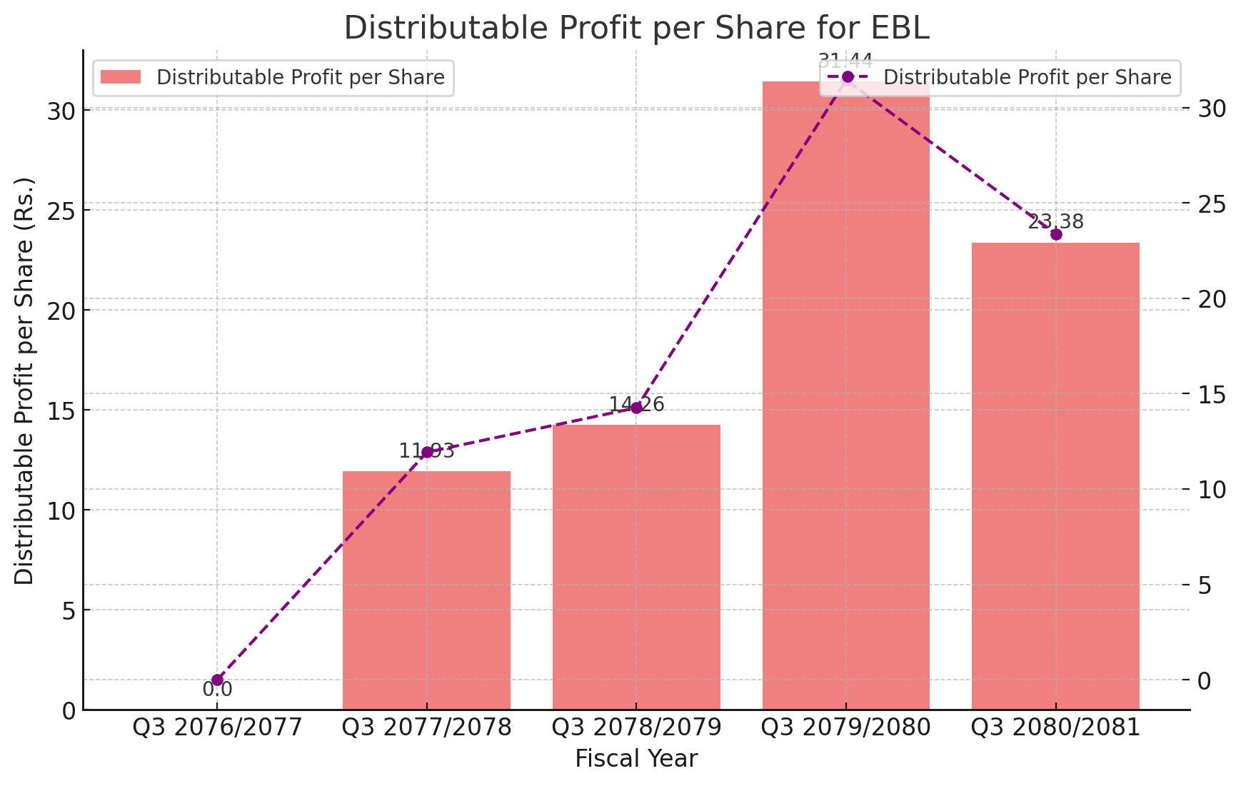 The data shows a remarkable improvement in the distributable profit per share for EBL over the last five years, starting from zero in the fiscal year 2076/2077. The steady increase in the following years reflects the bank's ability to generate higher profits available for distribution to shareholders.