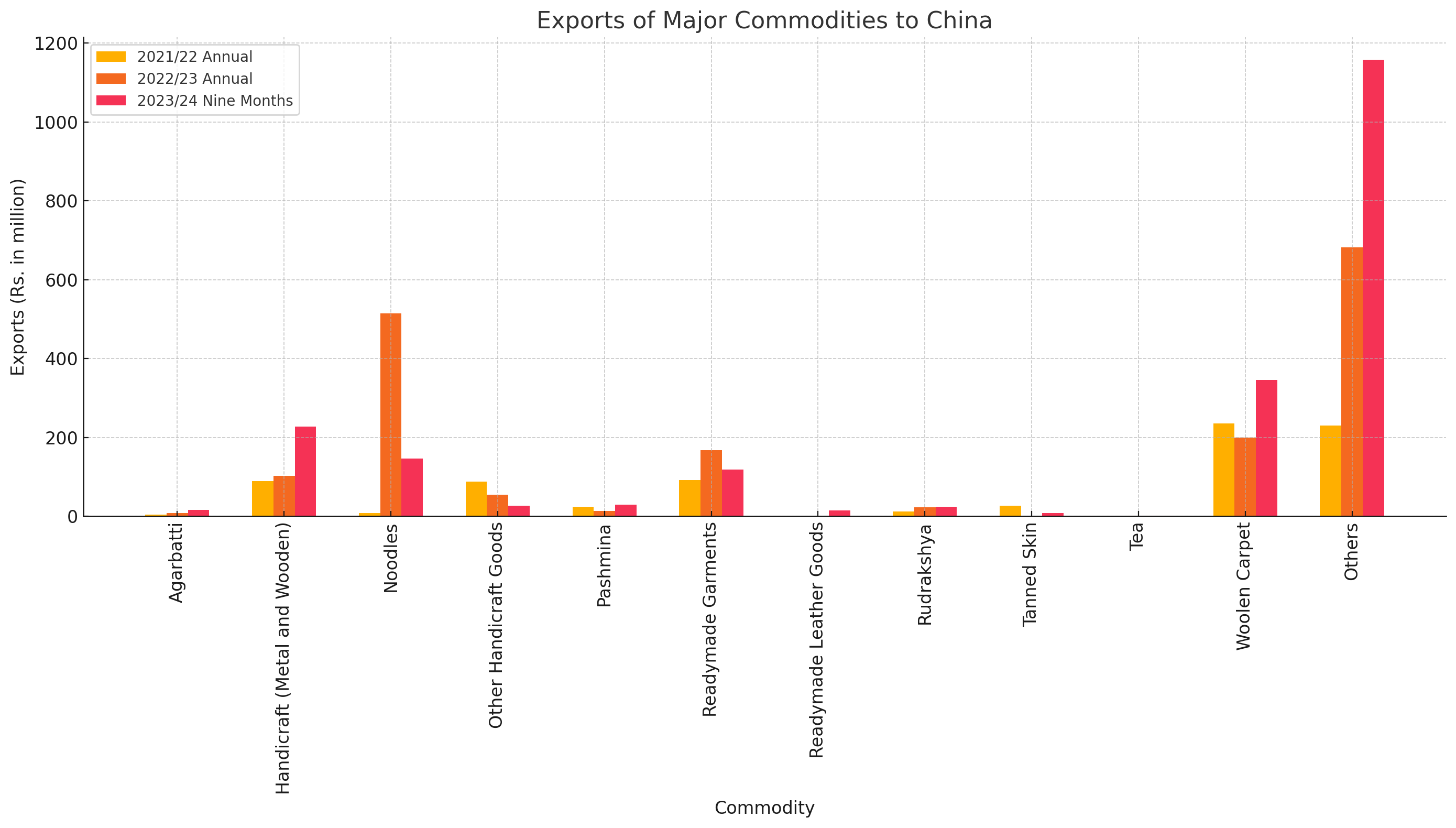 Recent data on Nepal's exports to China paints an intriguing picture of shifting trade dynamics over the last few years. The table highlights the export figures of major commodities, providing a detailed look at annual and nine-month data for fiscal years 2021/22, 2022/23, and provisional data for 2023/24.