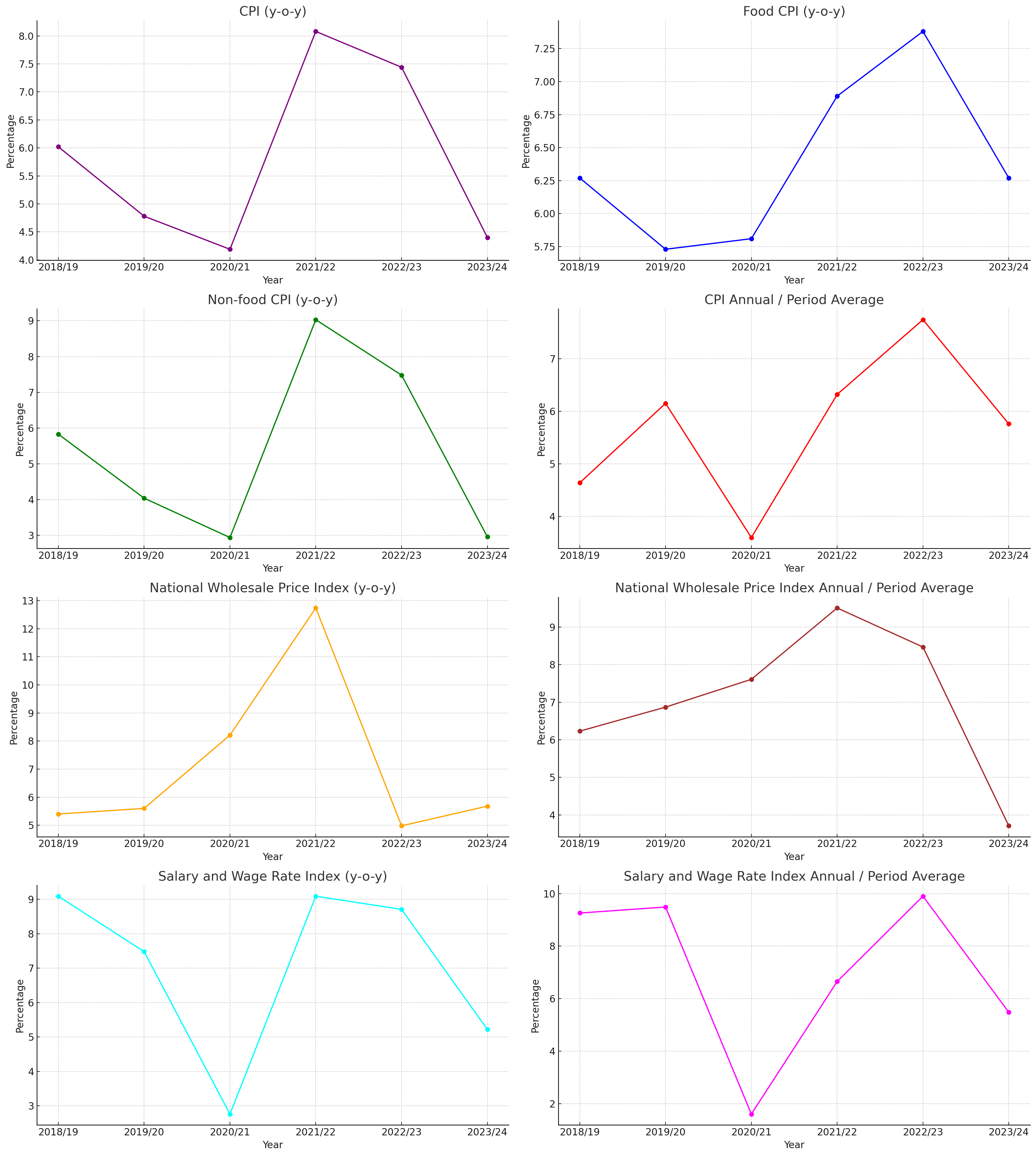 The Consumer Price Index (CPI) year-on-year showed significant fluctuations, peaking in 2021/22 and then declining in recent years, indicating periods of inflationary pressure followed by stabilization.