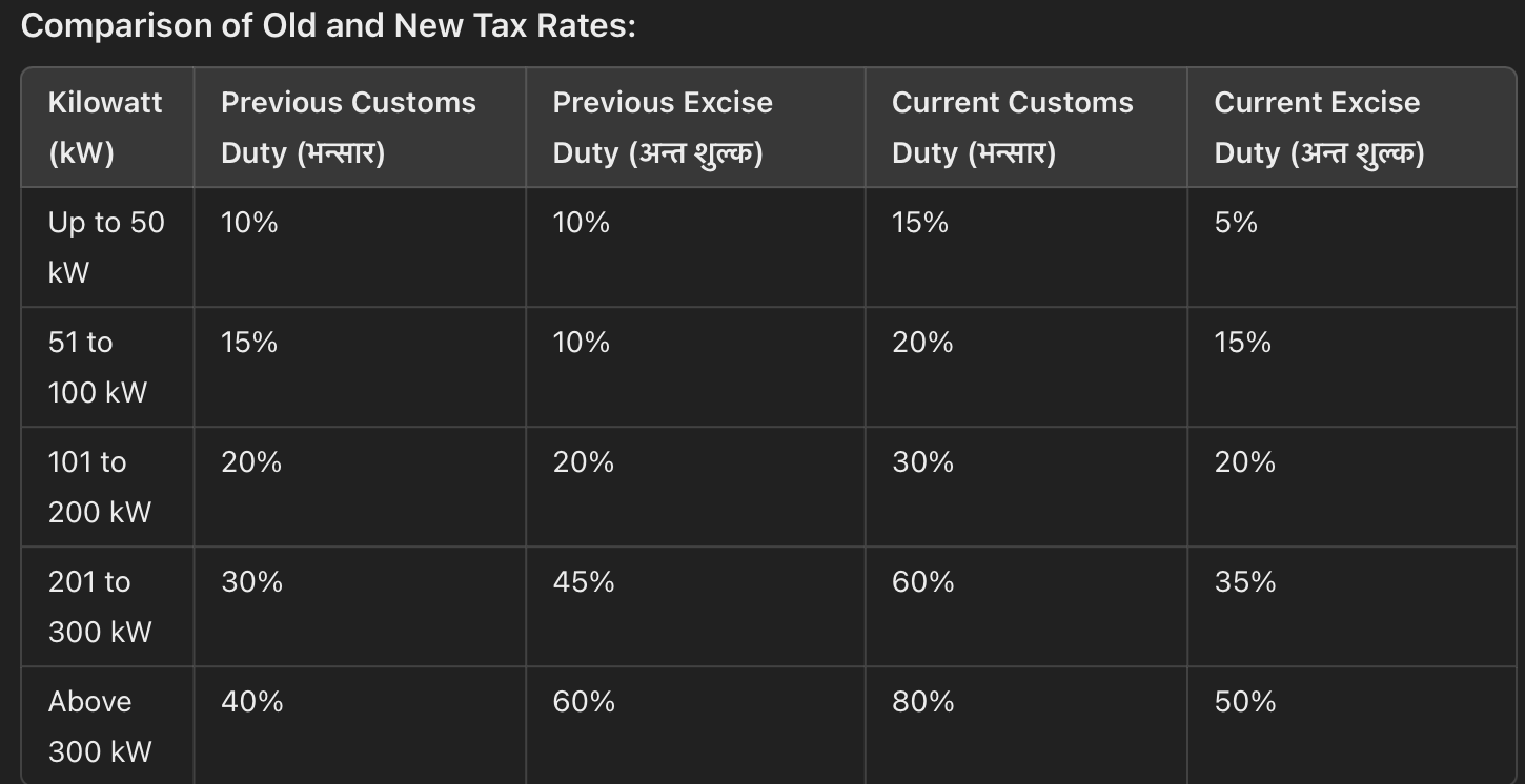 The tax rates for electric vehicles are divided into two main categories: customs duty (भन्सार) and excise duty (अन्त शुल्क). The changes are applied based on the power output of the electric vehicles measured in kilowatts.