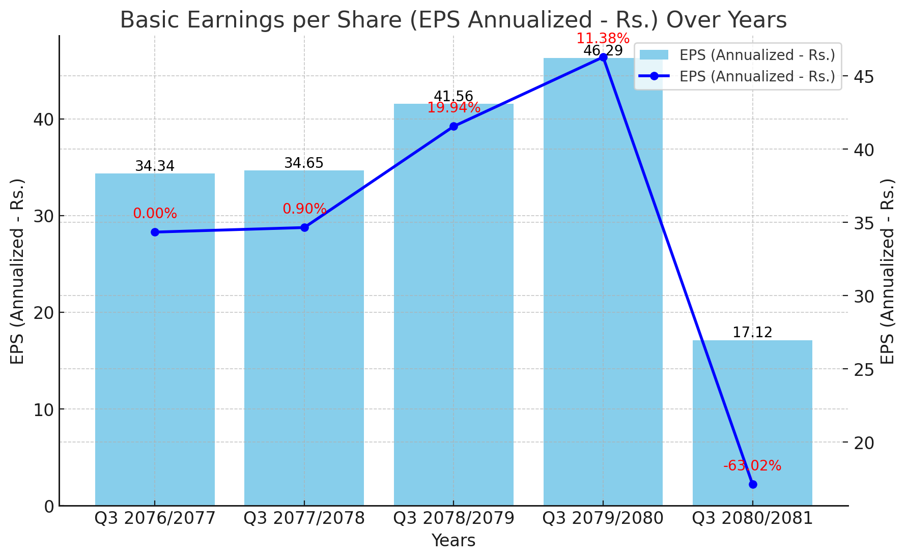 However, the latest data for Q3 2080/2081 shows a drastic downturn, with the EPS plummeting to Rs. 17.12. This sharp decline of 63.02% is concerning and signals potential underlying issues that may need addressing. Several factors could have contributed to this decline, including market volatility, economic downturns, regulatory changes, or internal challenges within the bank.