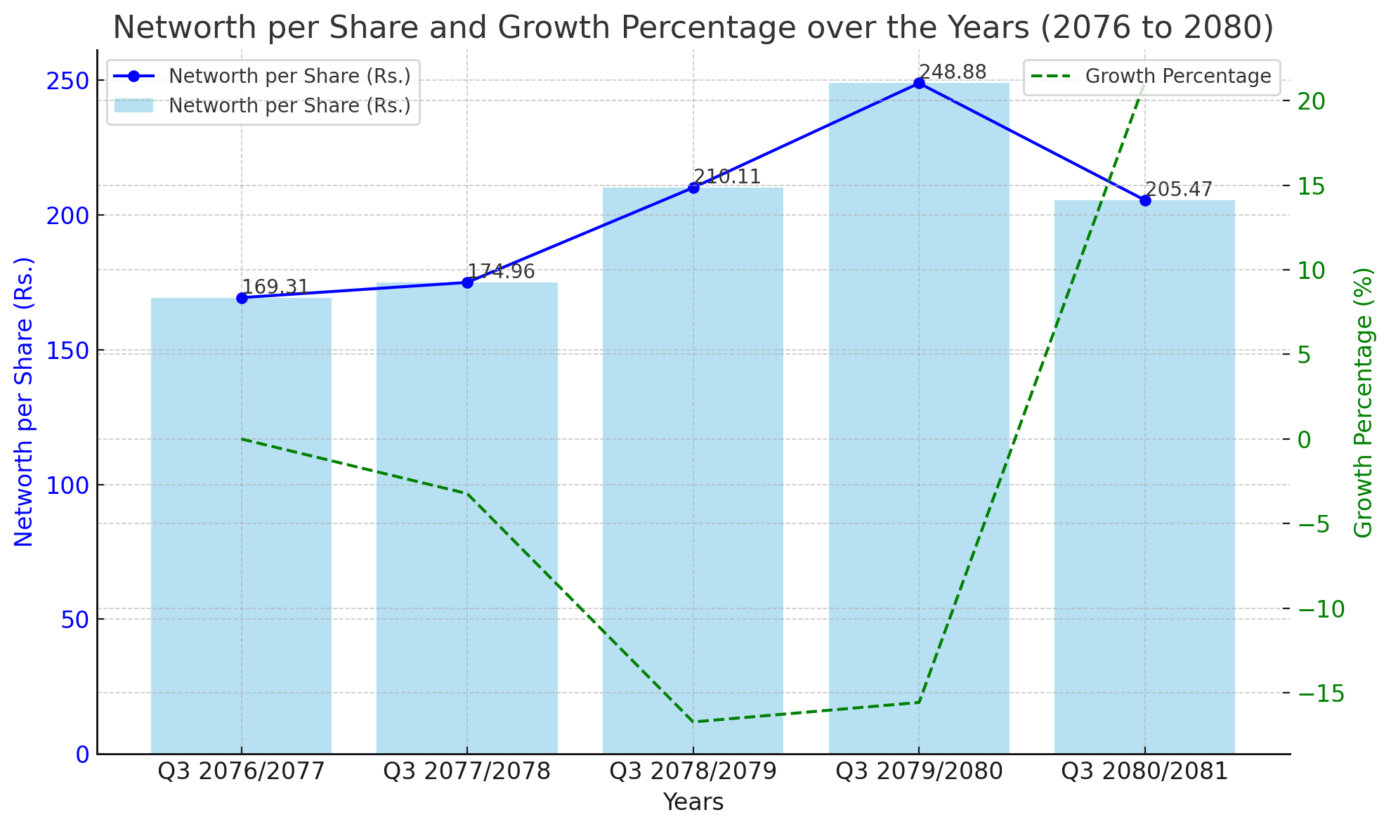 Starting from Q3 2076/2077, NICA's net worth per share stood at Rs. 169.31. Over the next three years, the company saw a steady increase, reaching Rs. 174.96 in Q3 2077/2078 and Rs. 210.11 in Q3 2078/2079. This upward trajectory culminated in a peak of Rs. 248.88 by Q3 2079/2080, marking a substantial growth of 47.1% from the base year.