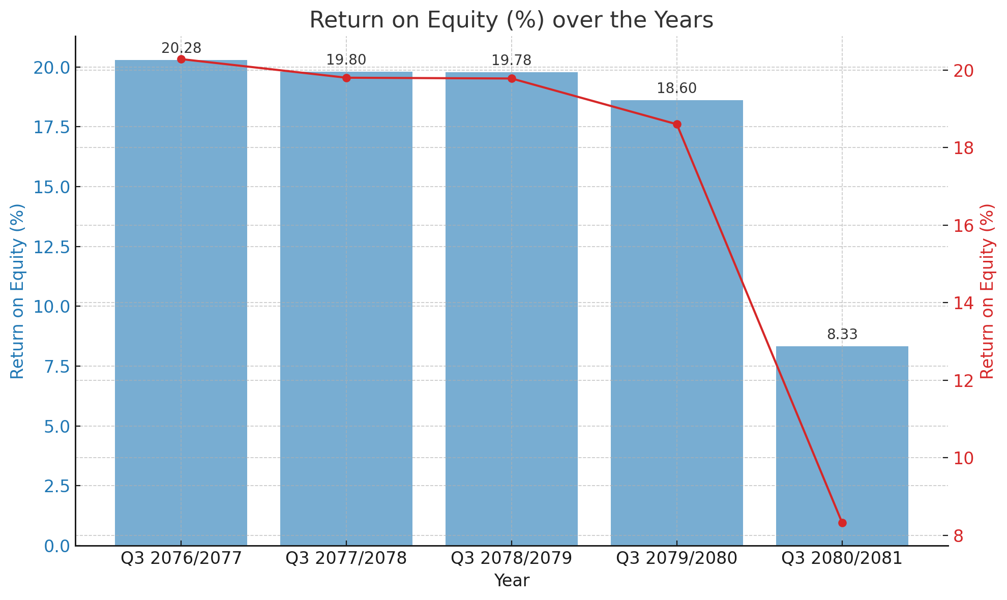 The sharpest decline occurred between Q3 2079/2080 and Q3 2080/2081, where the ROE plummeted by approximately 55.22%. This drastic reduction suggests underlying issues that need to be addressed to restore the bank's financial health.