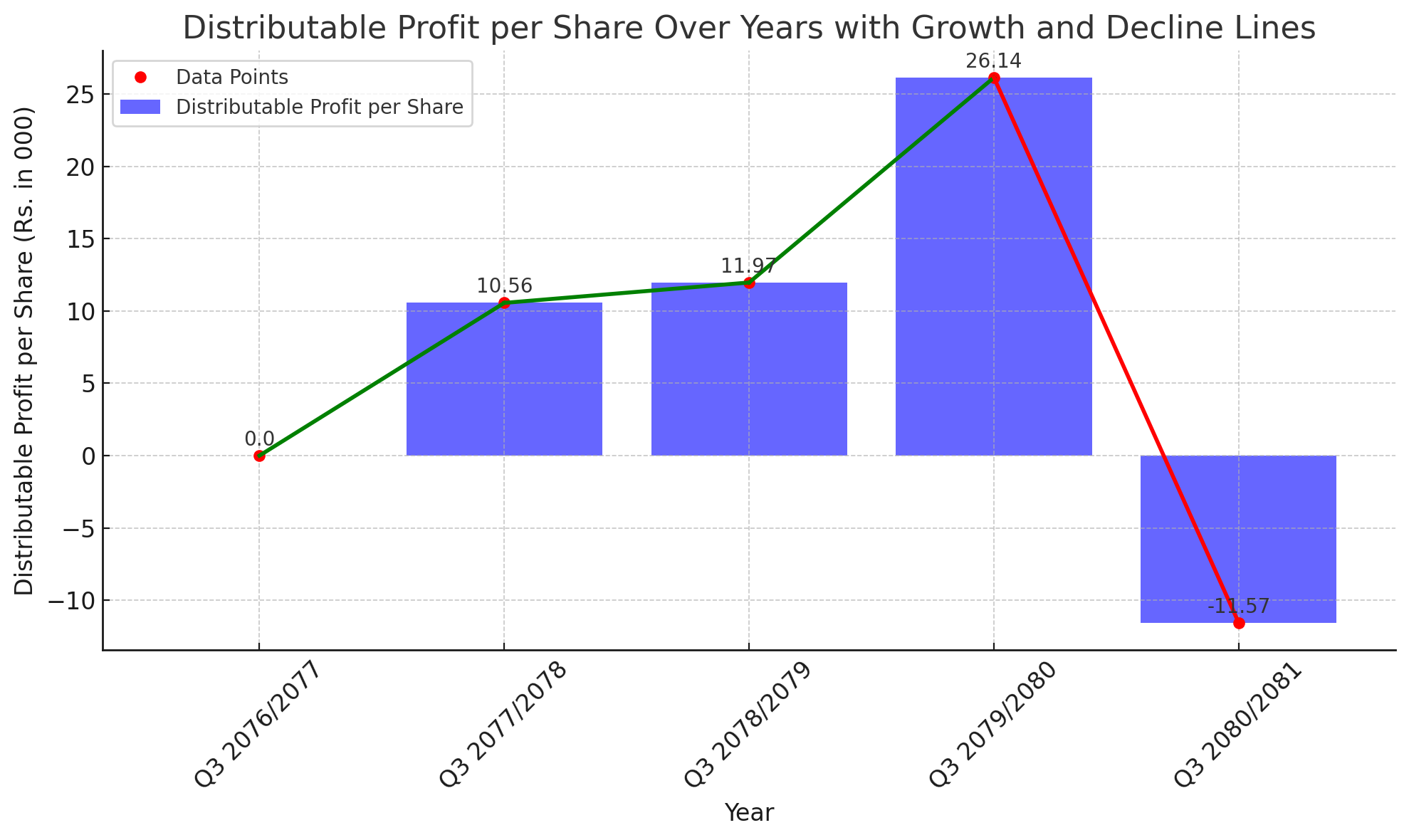 Q3 2079/2080: A remarkable surge saw the DPS soaring to Rs. 26.14. This significant leap indicates a period of exceptional profitability, potentially driven by strategic investments, increased market share, or cost optimizations.