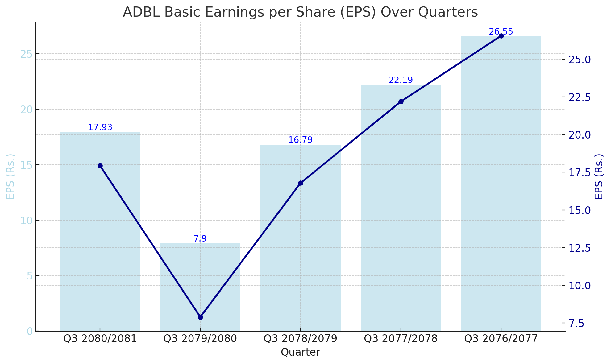 In the earlier quarters, Q3 2077/2078 and Q3 2076/2077, ADBL recorded higher EPS values of Rs. 22.19 and Rs. 26.55, respectively. These figures indicate periods of strong financial performance and effective earnings management, allowing the bank to achieve substantial profitability.