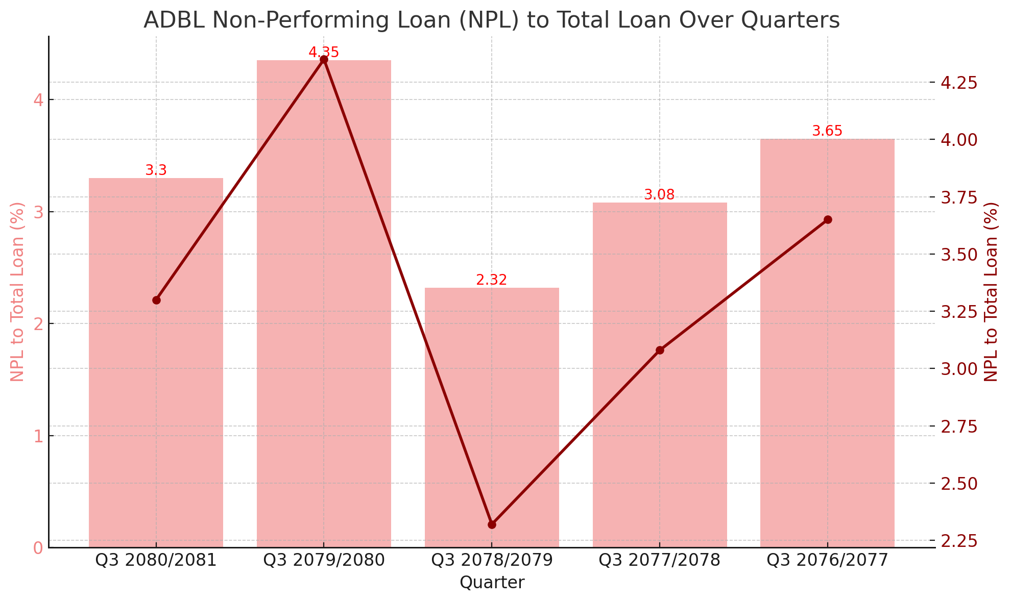 For the quarter ending Q3 2080/2081, ADBL reported an NPL ratio of 3.3%, a decrease from 4.35% in Q3 2079/2080. This reduction suggests an improvement in loan performance and a decrease in the proportion of non-performing loans relative to total loans.