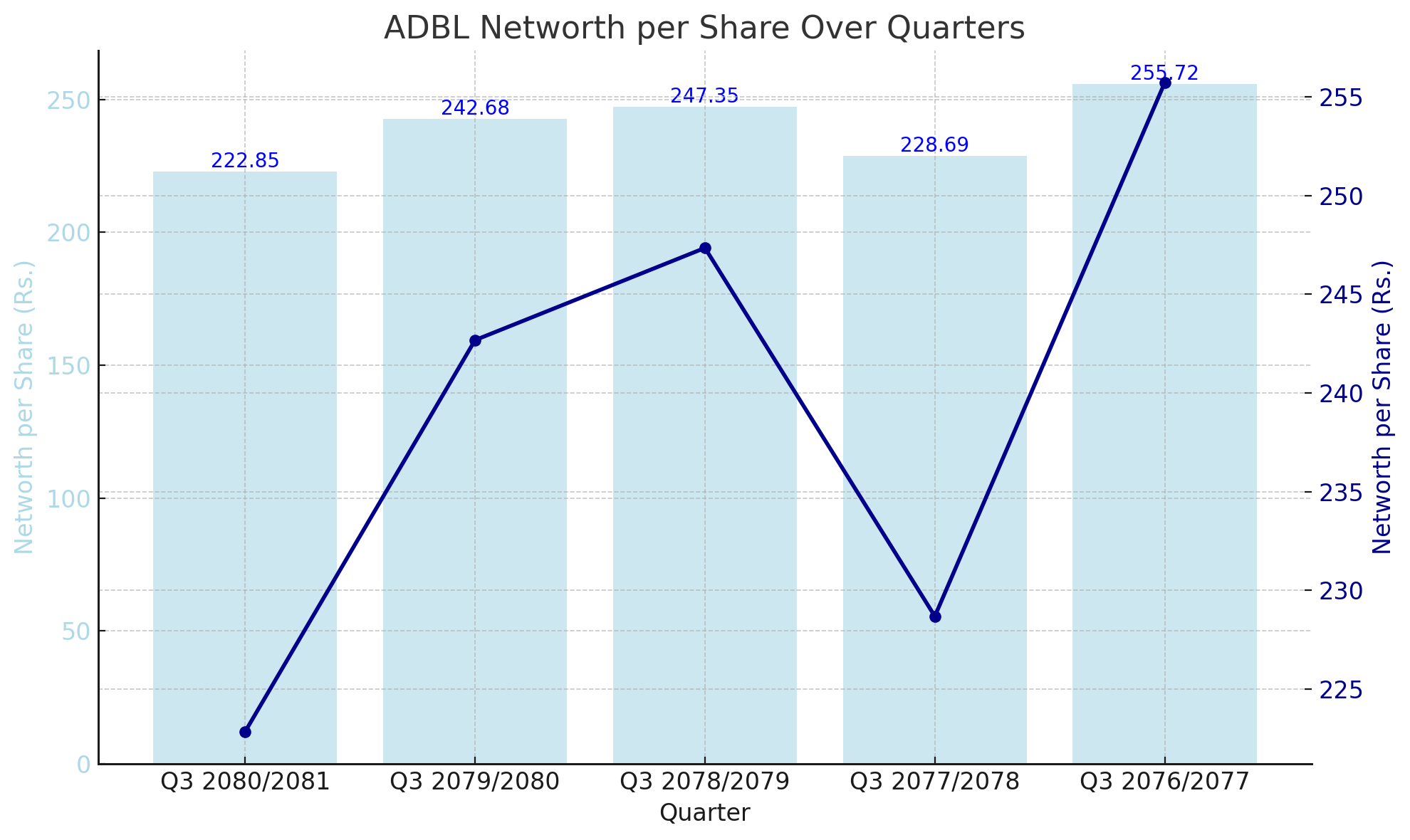 The highest Networth per Share in the observed period was Rs. 255.72, recorded in Q3 2076/2077. This peak reflects a period of strong asset valuation and retained earnings, demonstrating ADBL's financial strength at that time. However, the subsequent quarters showed a gradual decline, with a noticeable drop to Rs. 228.69 in Q3 2077/2078.