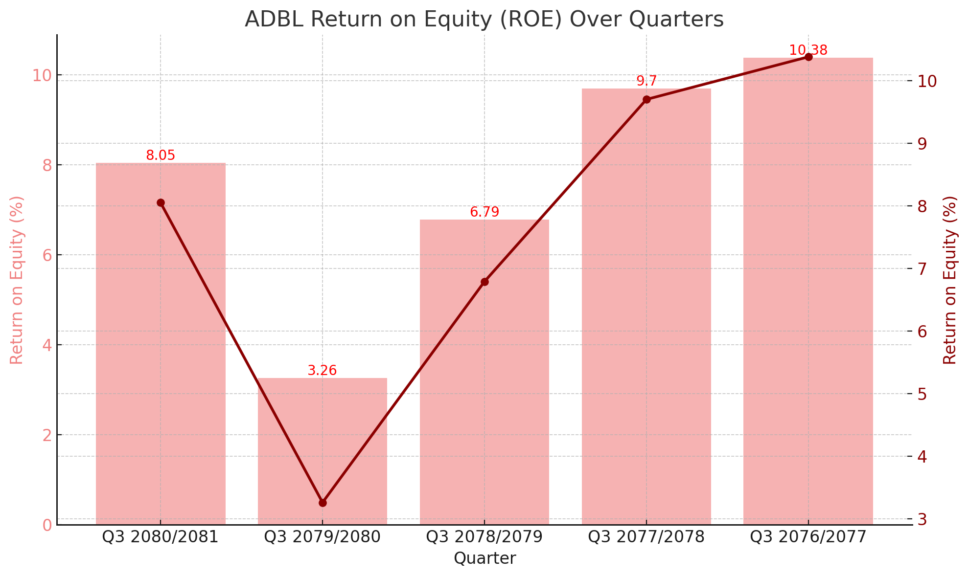 In the earlier quarters, Q3 2077/2078 and Q3 2076/2077, ADBL recorded higher ROE values of 9.7% and 10.38%, respectively. These figures reflect periods of strong financial performance and effective equity utilization, resulting in substantial returns for shareholders.