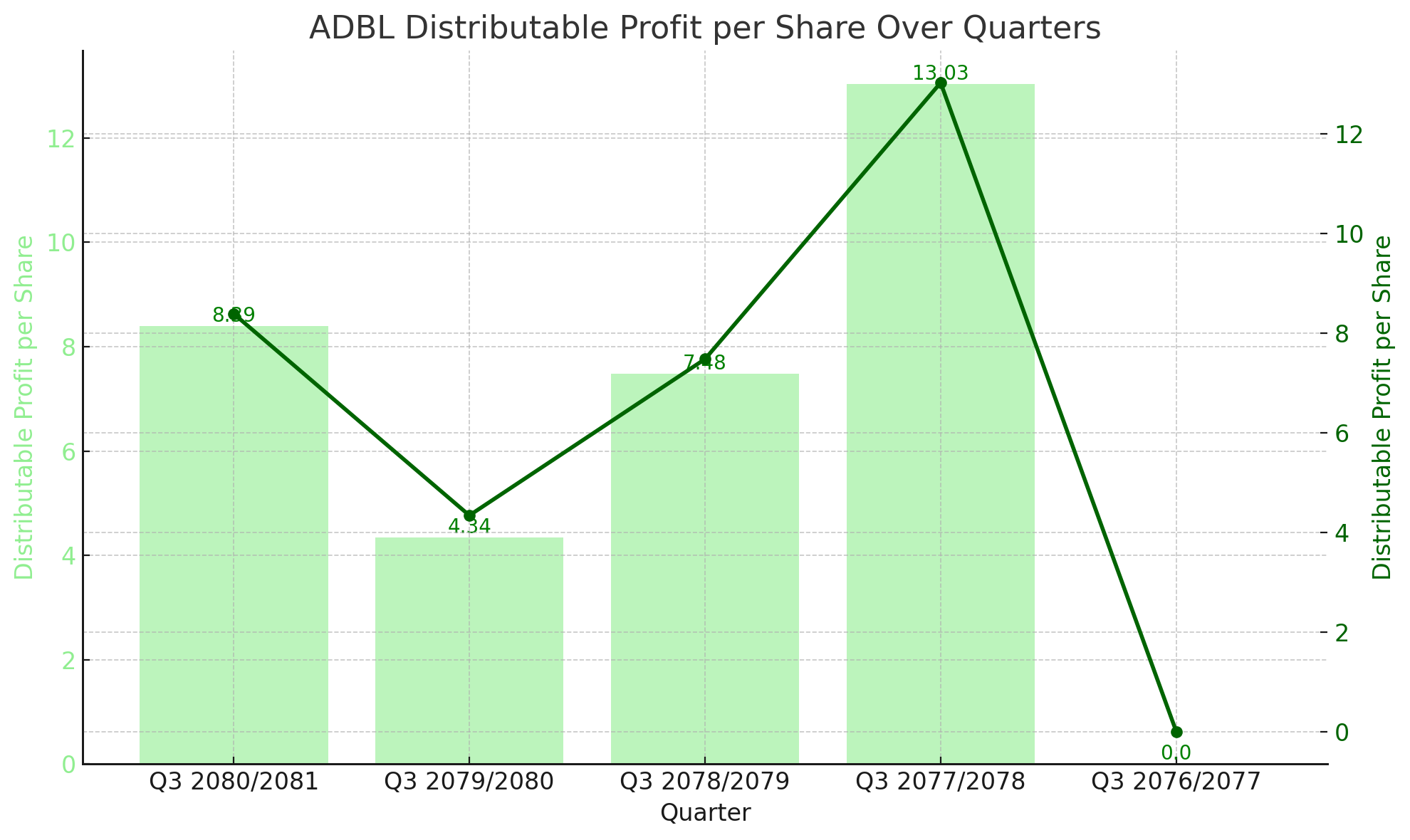 In the earlier quarters, Q3 2077/2078 and Q3 2076/2077, ADBL recorded Distributable Profit per Share values of Rs. 13.03 and Rs. 0, respectively. The high value in Q3 2077/2078 reflects a period of strong financial performance, while the zero value in Q3 2076/2077 indicates no distributable earnings, possibly due to operational losses or complete reinvestment of earnings.