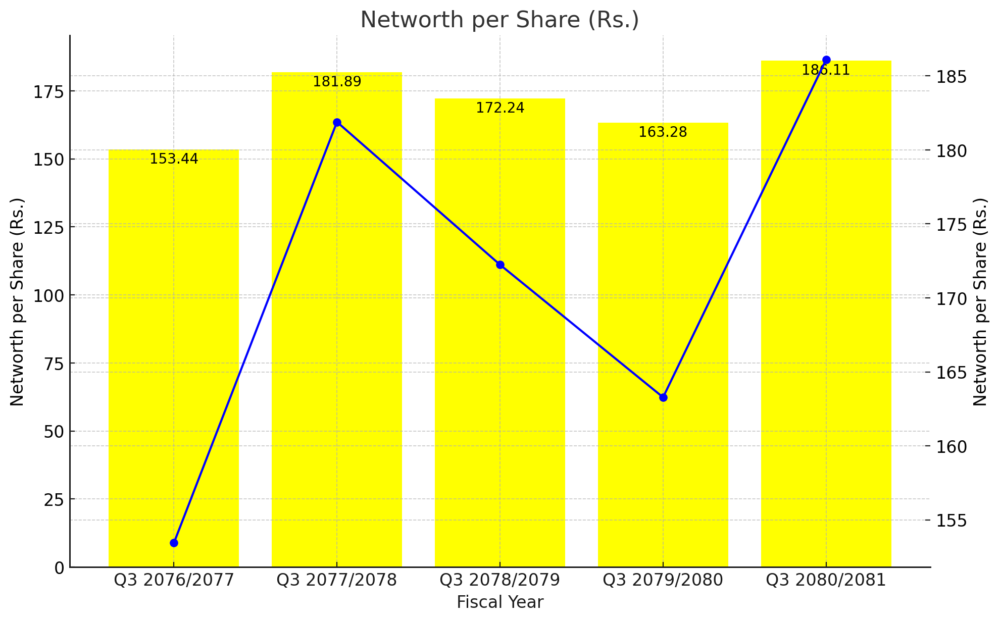 Q3 2078/2079: A Moderate Decline However, in Q3 2078/2079, the net worth per share decreased to Rs. 172.24. This 5.3% decline suggests some pressures on the bank’s equity, possibly due to higher dividend payouts, increased operational expenses, or investments in growth initiatives that temporarily impacted retained earnings.