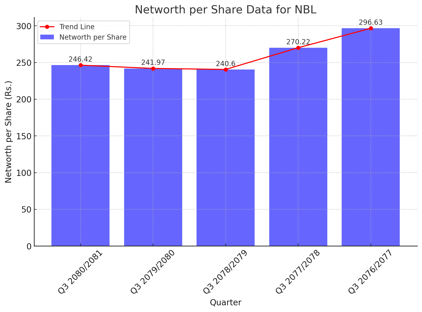 Nepal Bank Limited (NBL) has reported mixed performance in its Net Worth per Share over the past five years. The latest data for the third quarter of the fiscal year 2080/2081 shows a slight increase to Rs. 246.42, compared to Rs. 241.97 in the same quarter last year. However, the bank's net worth per share has generally trended downward over the five-year period.