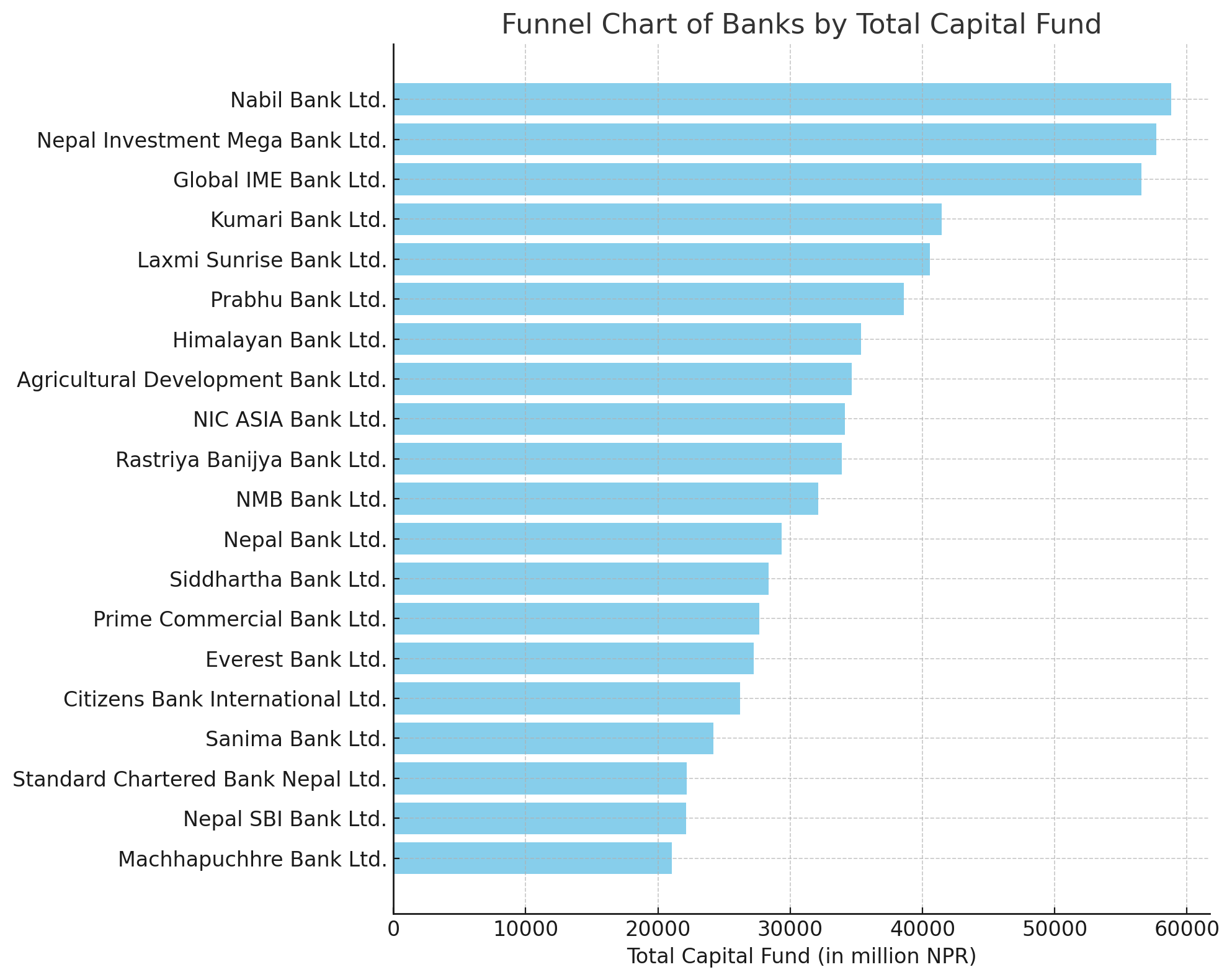 Other banks with relatively lower capital funds include Nepal SBI Bank Ltd., Standard Chartered Bank Nepal Ltd., and Sanima Bank Ltd., with funds between 21,130 to 24,196 million NPR.