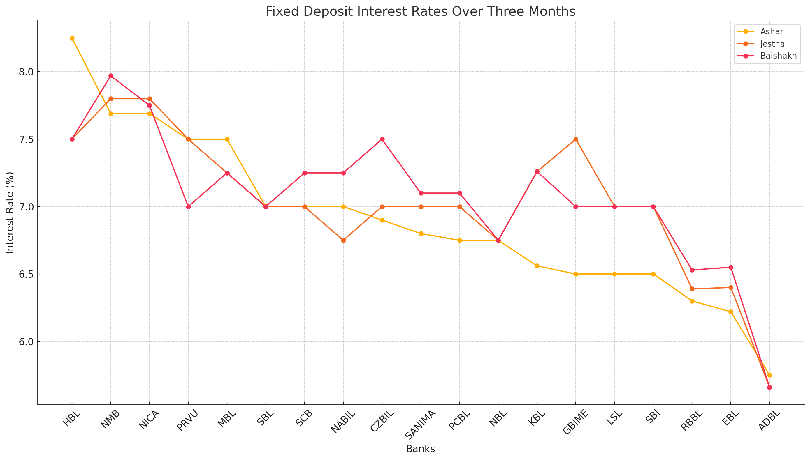 In the ever-evolving financial landscape, the interest rates on fixed deposits offered by various banks in Nepal have shown noticeable changes over the past three months. This report delves into the interest rates for Ashar, Jestha, and Baishakh, providing insights and interpretations based on the observed trends