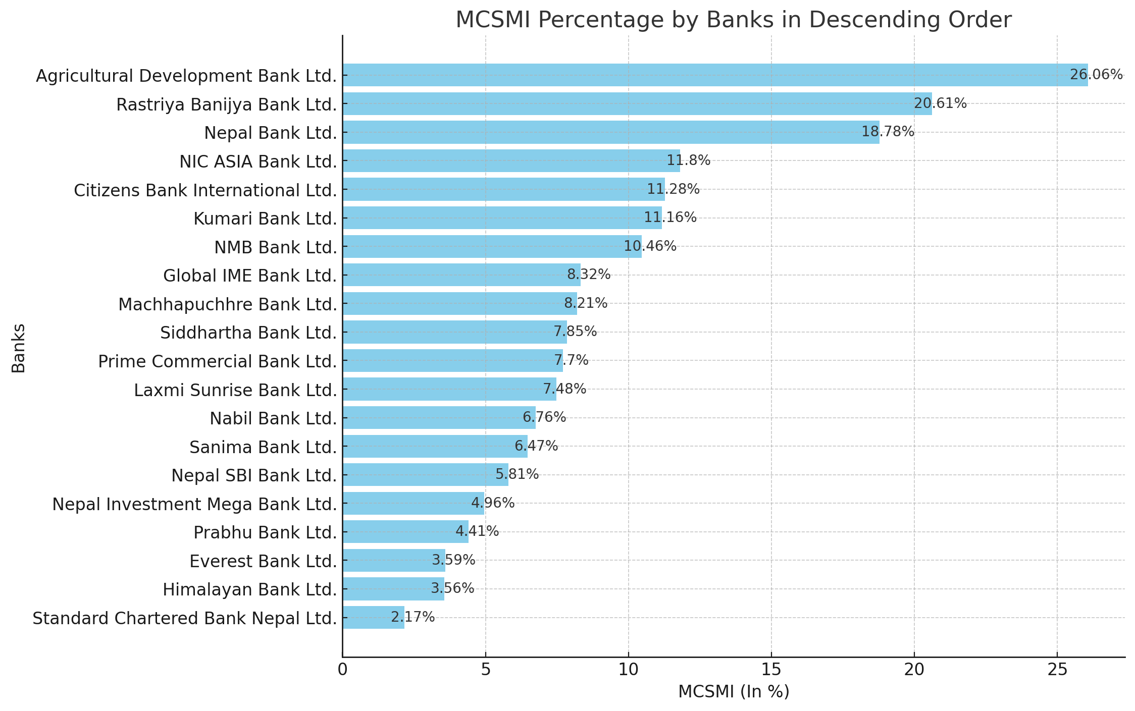 Analyzing individual banks, we observe significant variations in their commitment levels. The Agricultural Development Bank Ltd. leads the pack with a substantial 26.06 percent of its loans directed towards MCSMI. This is followed by Rastriya Banijya Bank Ltd. at 20.61 percent and Nepal Bank Ltd. at 18.78 percent. On the other end of the spectrum, Standard Chartered Bank Nepal Ltd. shows the lowest commitment with only 2.17 percent, and Himalayan Bank Ltd. at 3.56 percent.