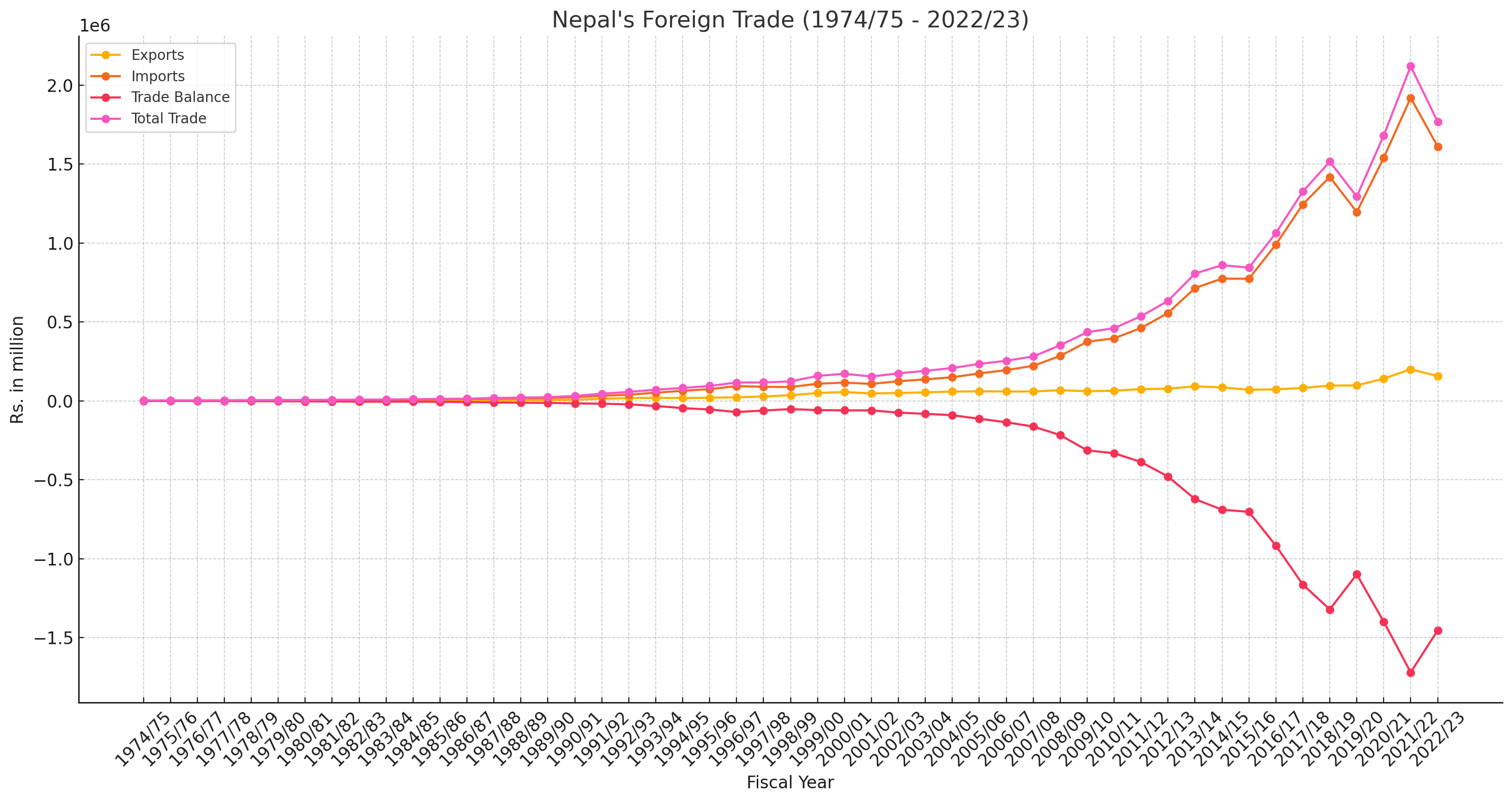 Nepal's foreign trade landscape has witnessed significant fluctuations over the past five decades, reflecting both internal economic policies and external global market dynamics. The data from the fiscal year 1974/75 to 2022/23 provides an insightful view of the trends in exports, imports, trade balance, and total trade, offering a comprehensive understanding of the country's economic trajectory.