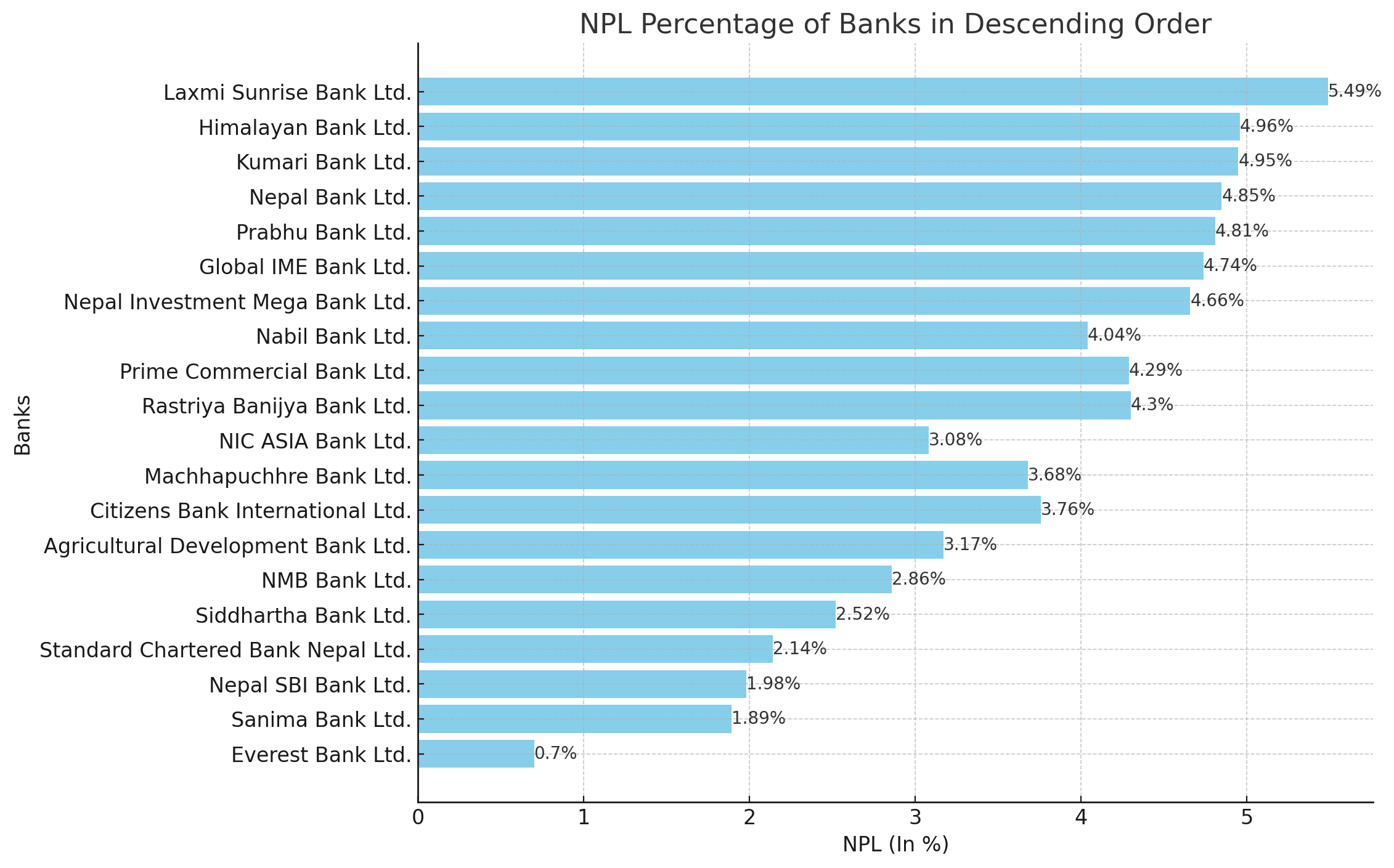 On a positive note, some banks have managed to maintain relatively low NPL percentages. Everest Bank Ltd. reports an impressive 0.70%, followed by Sanima Bank Ltd. at 1.89% and Nepal SBI Bank Ltd. at 1.98%. These banks exemplify prudent lending practices and effective risk management strategies, serving as benchmarks for others in the sector.