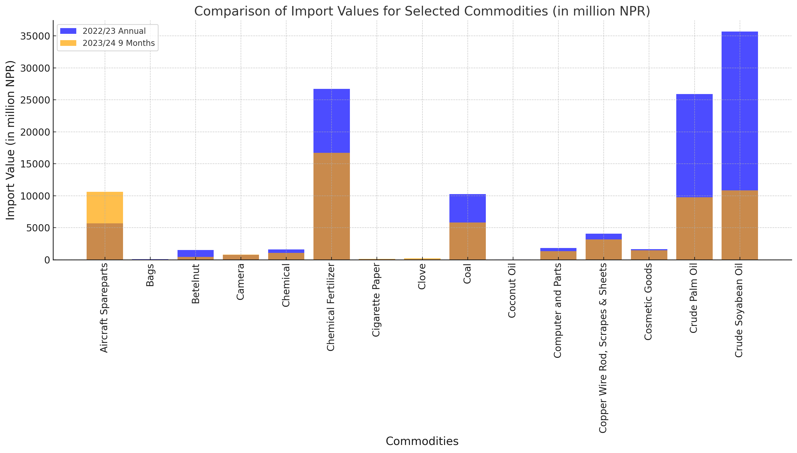 Overall Import Decline: The total imports for the fiscal year 2022/23 stood at NPR 290,660.7 million, which has dropped to NPR 169,694.1 million in the first nine months of 2023/24, marking a significant decline of 27.1%.