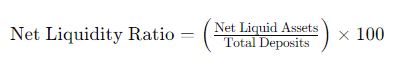 This ratio measures the proportion of a bank’s liquid assets relative to its total deposits. Liquid assets include cash, cash equivalents, and high-quality liquid instruments that can be quickly converted into cash with minimal loss. By maintaining a Net Liquidity Ratio of at least 20%, banks can ensure they have enough liquidity to meet immediate withdrawal requests and other short-term liabilities.
