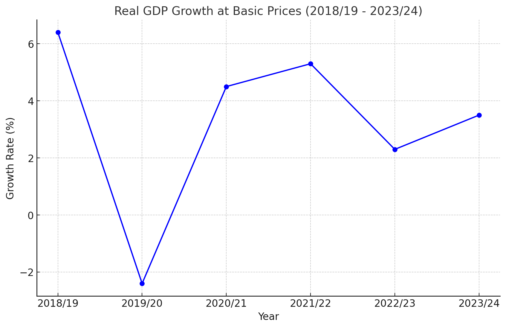The Real GDP at basic prices grew by 6.4% in 2018/19, indicating robust economic activity. This period likely saw increased production, investment, and consumption across various sectors, reflecting a healthy and expanding economy.