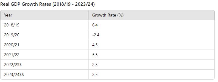 A significant contraction of -2.4% occurred in 2019/20. This negative growth rate could be attributed to several factors, including economic shocks, reduced consumer spending, or global economic conditions. Such a decline often indicates recessions, increased unemployment, and reduced industrial output.