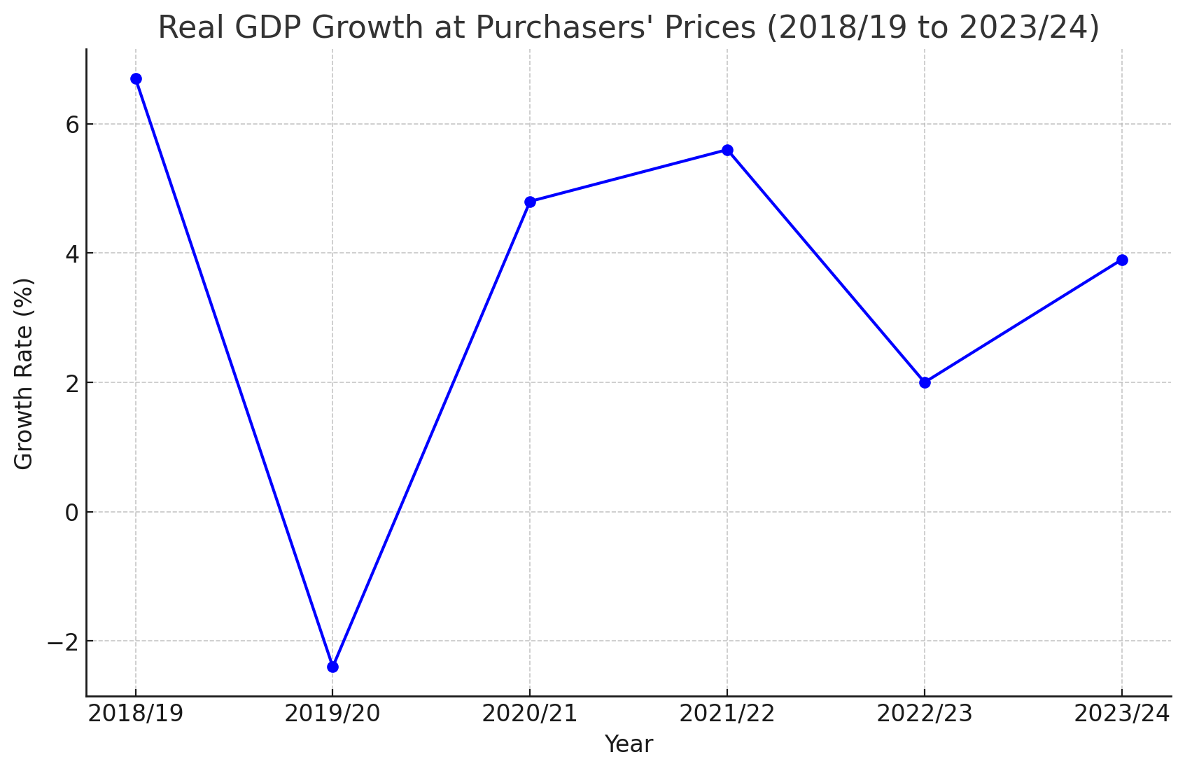 2021/22: 5.6% Continued Growth Building on the previous year's recovery, 2021/22 saw continued growth with a 5.6% increase in real GDP at purchasers' prices. This steady growth suggests that the economy was on a stable path to recovery, with sustained consumer demand and business investments playing a crucial role. It reflects an overall positive economic sentiment and effective policy measures supporting growth.