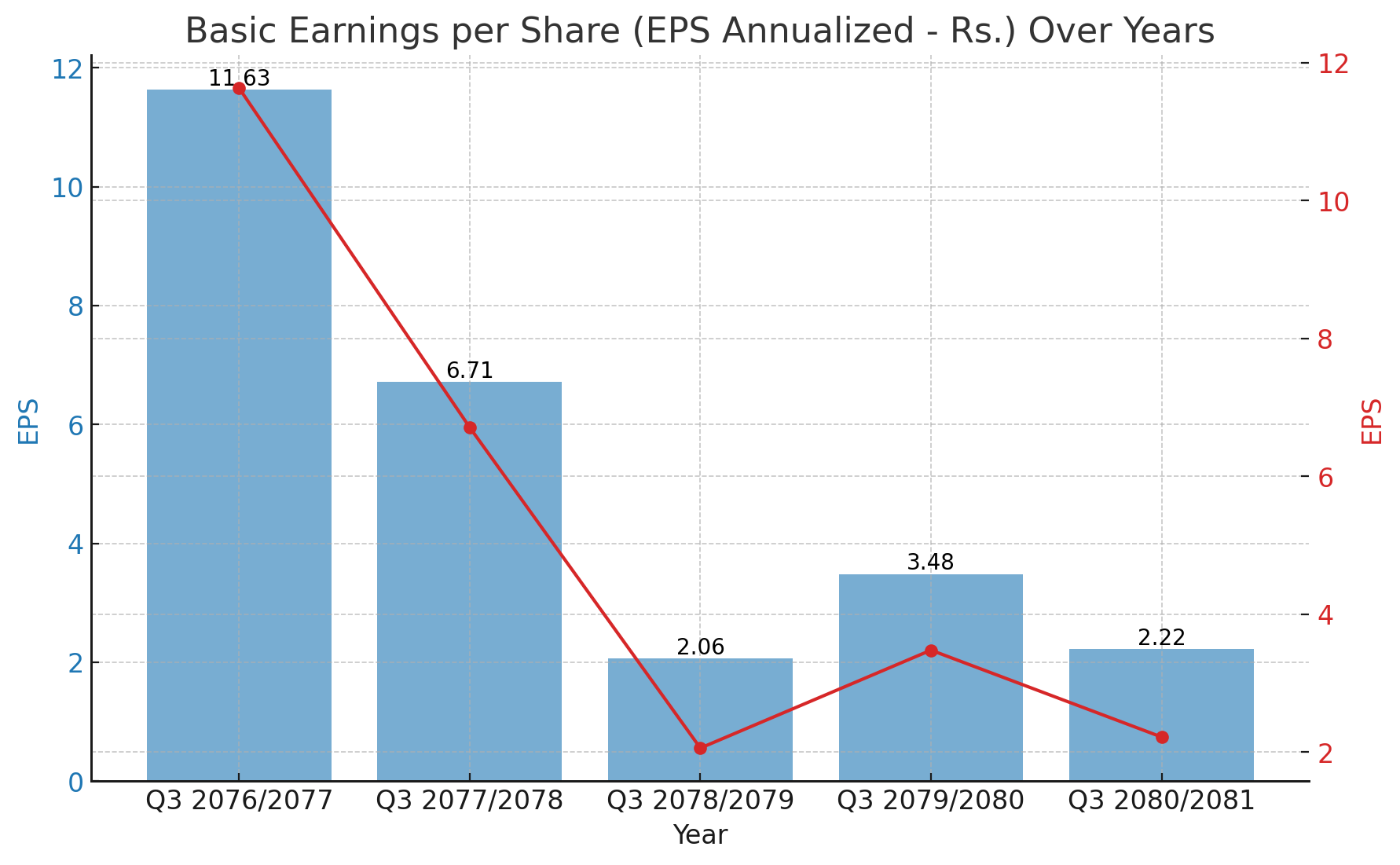 Q3 2078/2079: The EPS further dipped to Rs. 2.06, reflecting a continuing decline in profitability.