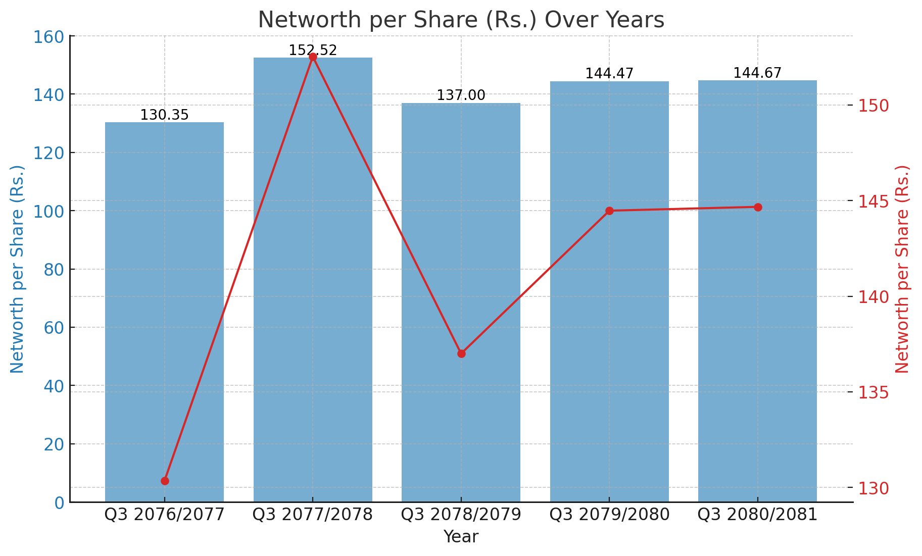 Q3 2080/2081: The net worth per share for the most recent quarter is Rs. 144.67, showing a slight increase from the previous year.