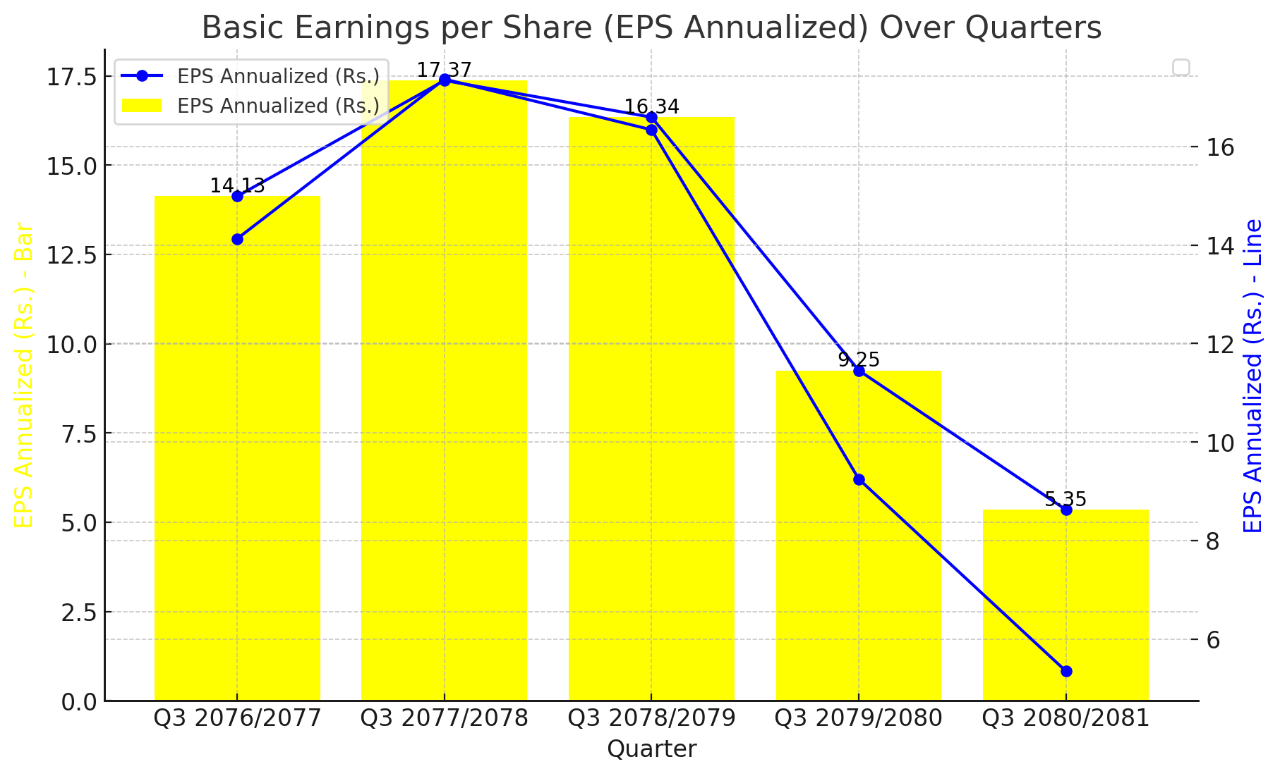 Q3 2080/2081: The EPS has plunged to 5.35, reflecting the lowest point in the five-year span.