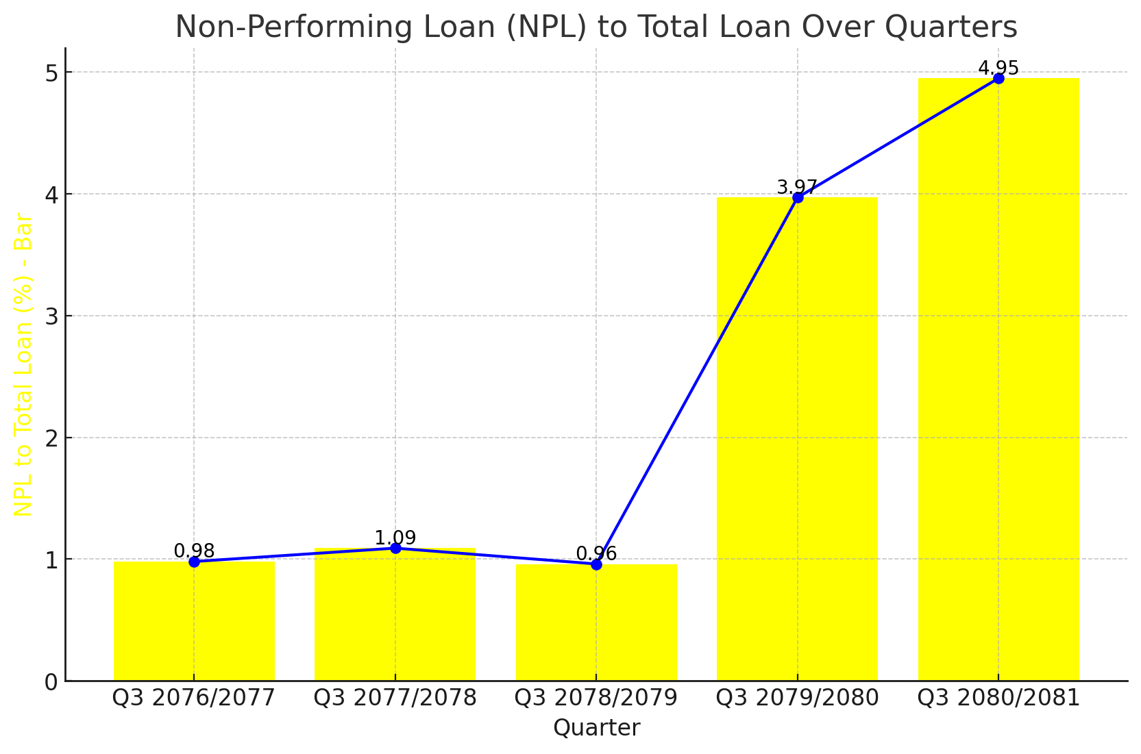 Q3 2080/2081: The NPL ratio has surged to 4.95%, the highest in the recorded period.
