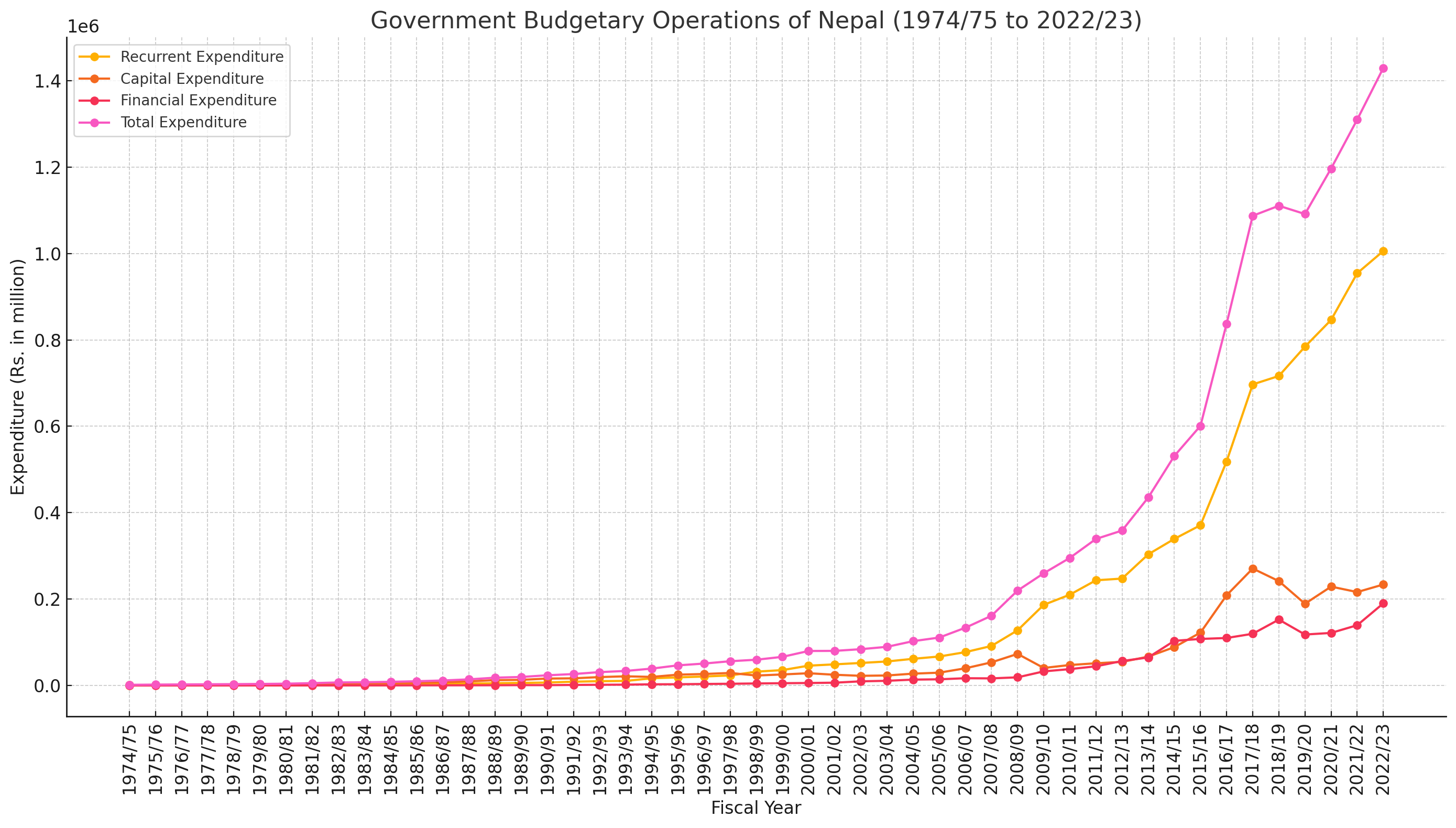 Financial Expenditure: Although financial outlays have been relatively modest compared to recurrent and capital expenditures, they grew considerably, reaching Rs. 190,108.7 million in 2022/23 from a mere Rs. 14.5 million in 1974/75. This category often includes debt servicing and other financial obligations.