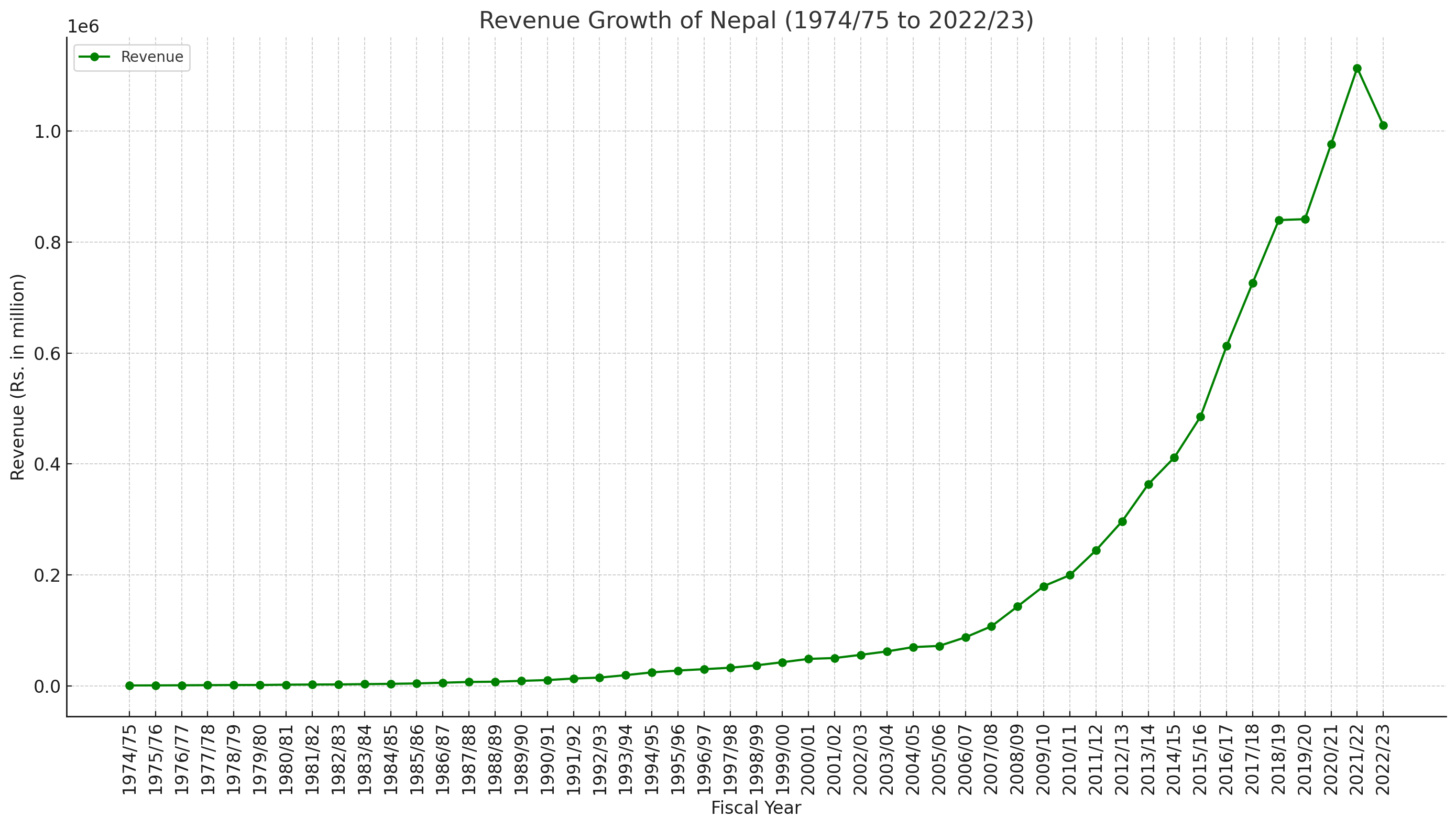 Government revenue has also shown substantial growth, from Rs. 1,007.0 million in 1974/75 to Rs. 1,010,394.6 million in 2022/23. This growth highlights improvements in tax collection, economic expansion, and enhanced fiscal management. However, the gap between expenditure and revenue has widened, necessitating increased borrowing and foreign assistance.