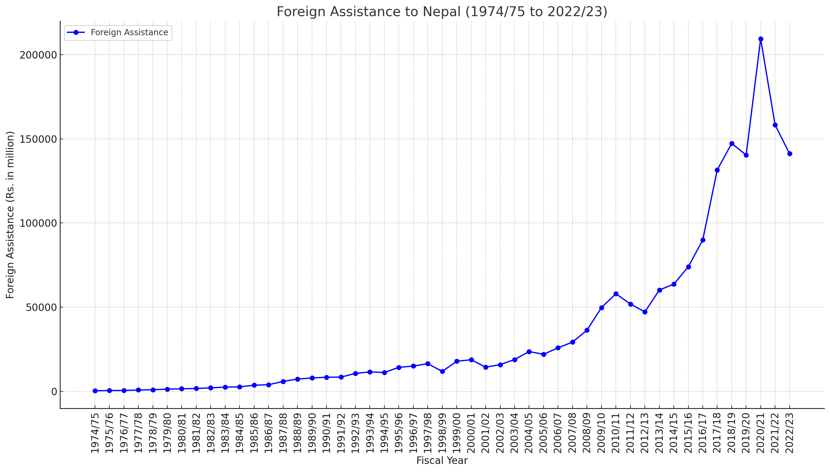 Nepal's fiscal journey from 1974/75 to 2022/23 showcases a significant evolution in government budgetary operations, reflecting broader economic trends and policy shifts over the decades. Analyzing data on government expenditures, revenues, foreign assistance, and domestic loans reveals key insights into the country's financial health and strategic priorities.