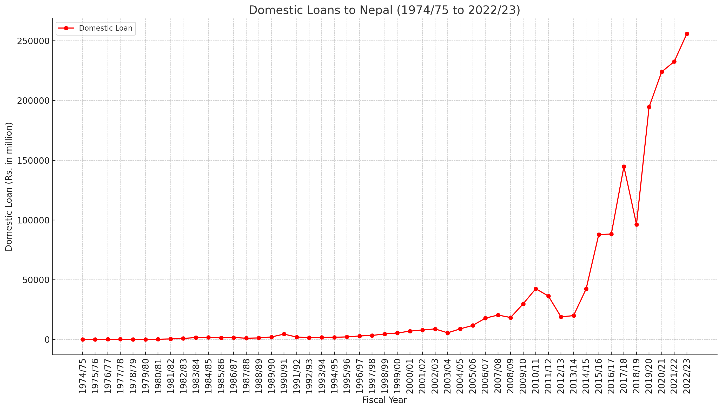 Domestic Loans: The government's reliance on domestic borrowing has also increased. Domestic loans rose from Rs. 100.0 million in 1974/75 to Rs. 255,997.7 million in 2022/23. This trend indicates a growing capacity for internal resource mobilization but also highlights the increasing debt burden.