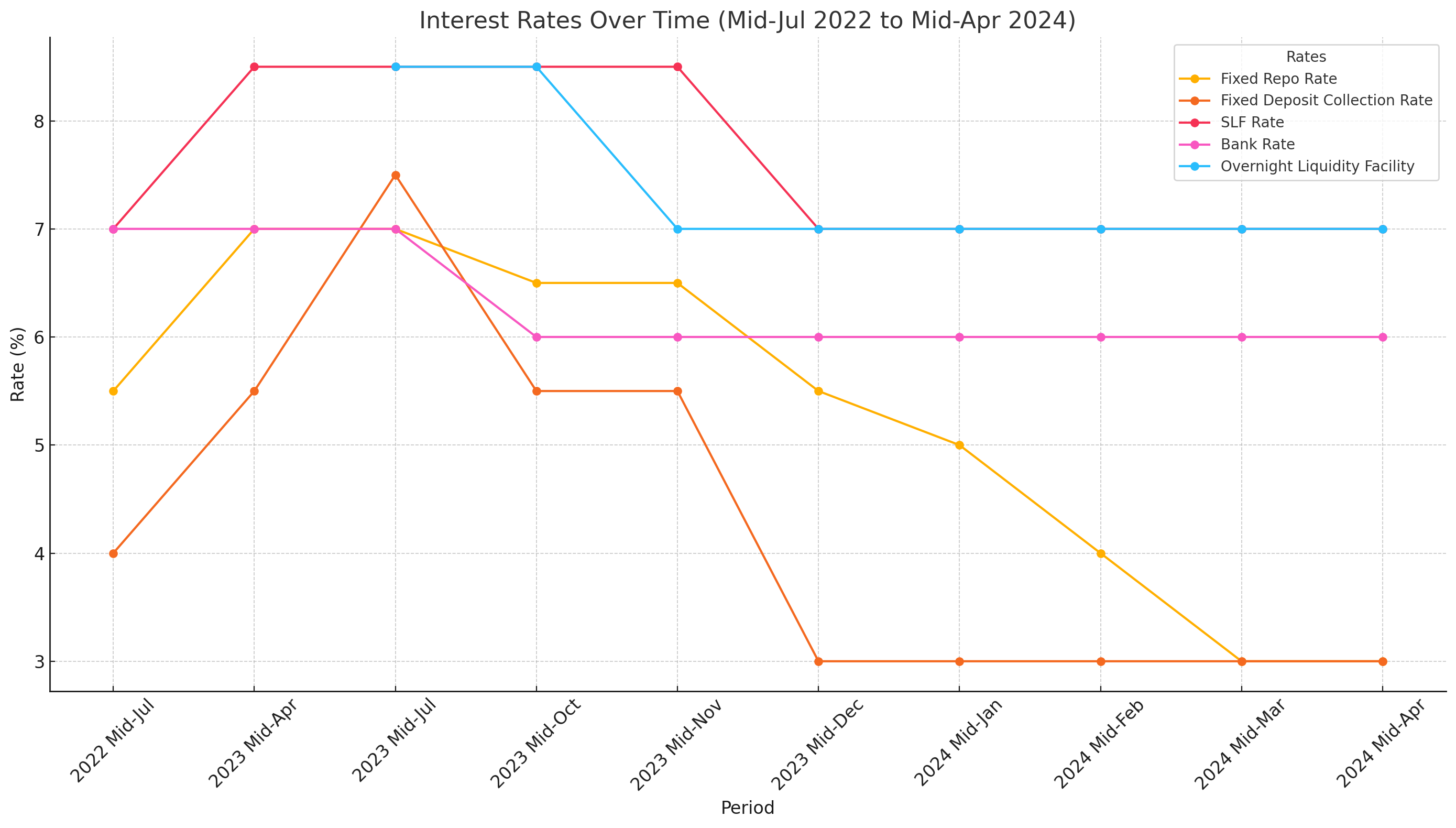 Fixed Repo Rate (Corridor): Starting at 5.5% in mid-July 2022, the rate saw a notable increase to 7.0% by mid-April 2023. It experienced fluctuations, peaking at 7.5% in mid-July 2023, before declining steadily to 5.5% by mid-April 2024.
