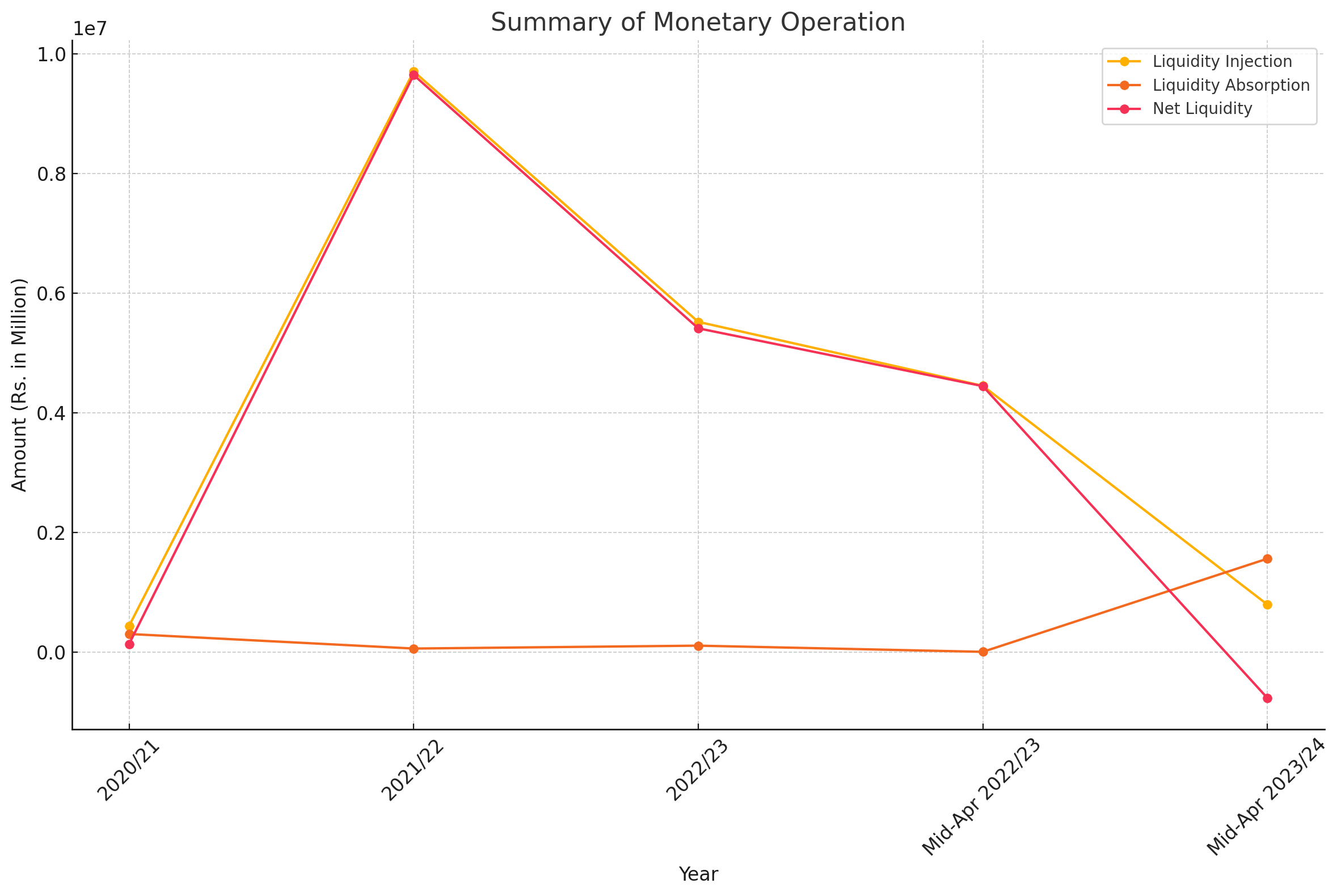 The monetary operation summary showcases the central bank's proactive and adaptive measures in managing Nepal's liquidity landscape. These operations are crucial for maintaining financial stability and supporting economic growth, reflecting a careful balance between injecting liquidity to stimulate the economy and absorbing excess liquidity to prevent inflation.