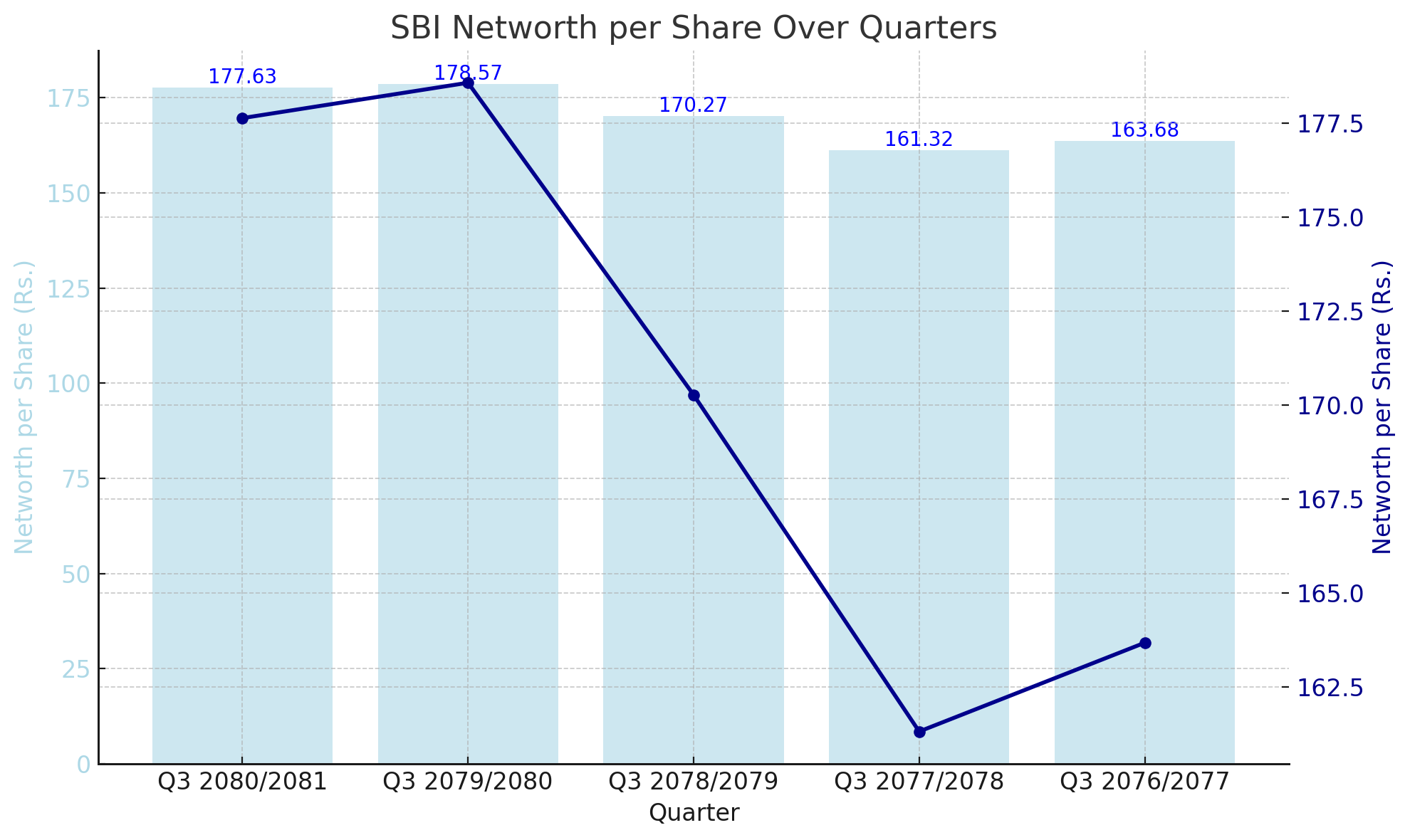 Earlier quarters, Q3 2077/2078 and Q3 2076/2077, recorded Networth per Share values of Rs. 161.32 and Rs. 163.68, respectively. These figures highlight a period of gradual improvement, showcasing SBI's steady growth and strengthening financial position over time.