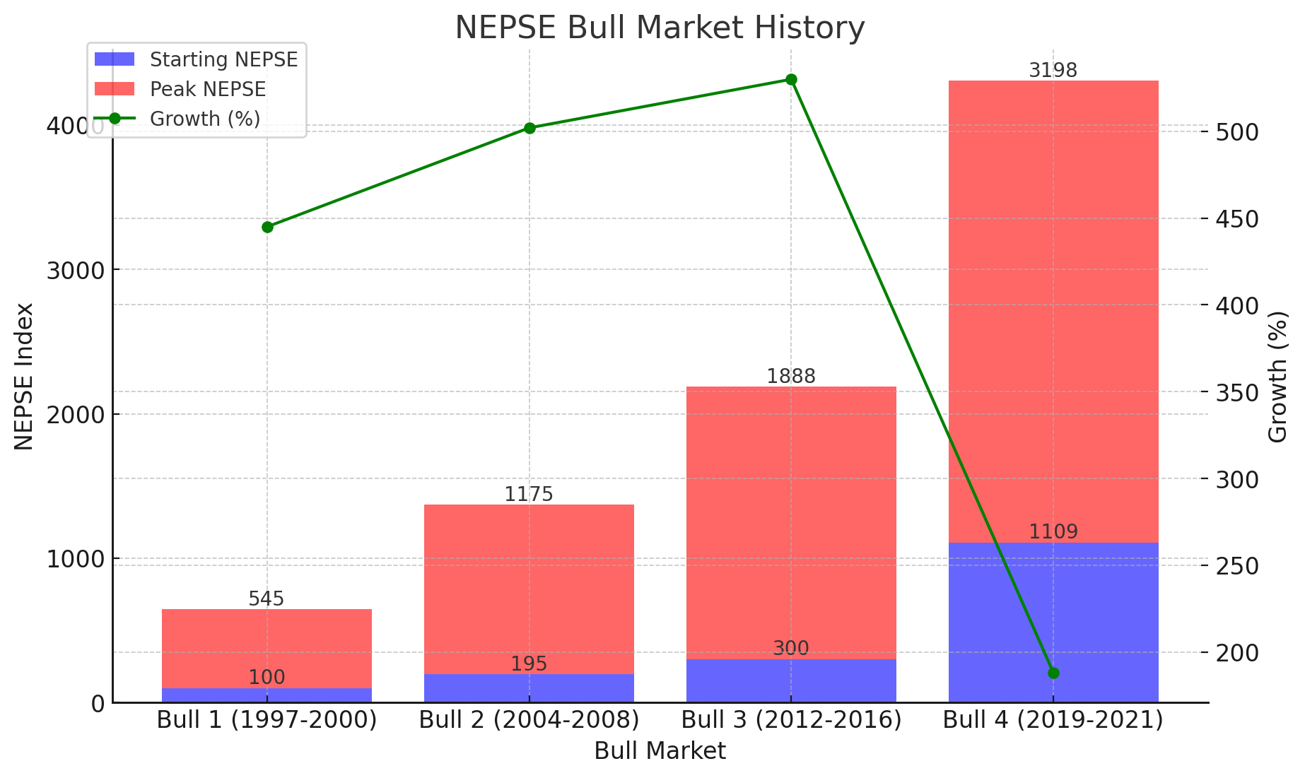 Bull 1 (1997-2000): NEPSE rose from 100 to 545, an increase of 445%.