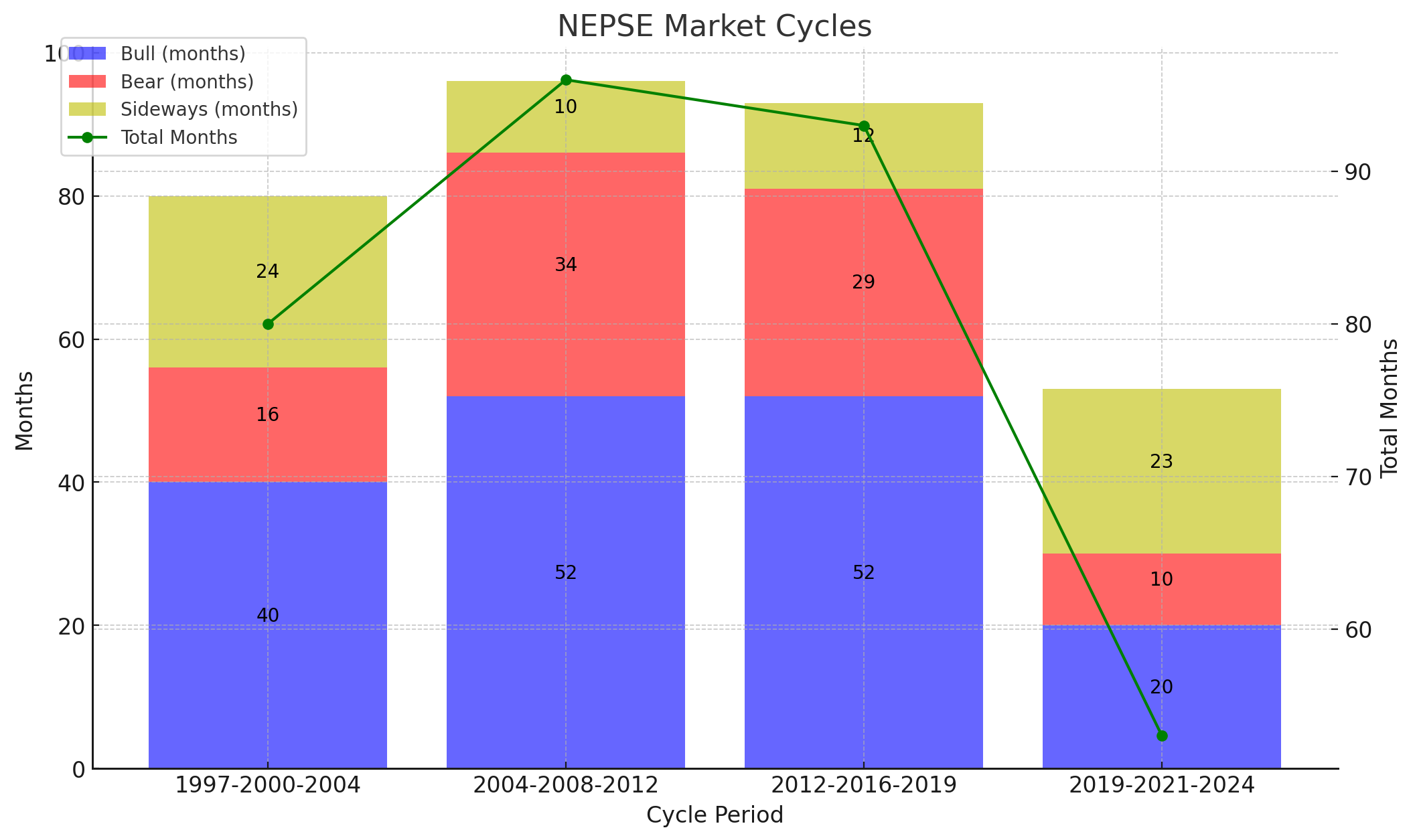 The cycles of bull, bear, and sideways markets continuously repeat. In NEPSE (Nepal Stock Exchange), these cycles have been observed as follows: